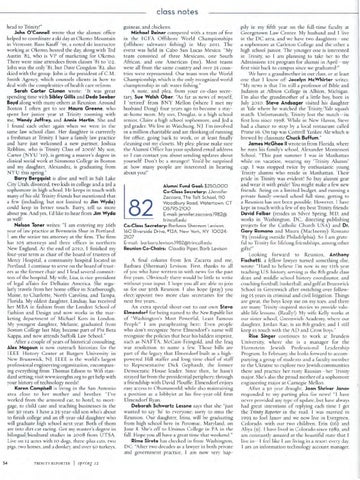pily in my fifm year on the full -time faculty at Georgetown Law Center. My husband and l live in the DC area, and we have two daughters- one a so phomore at Carleton College and me other a high school junior. The younger one is interested in Trinity, so I am planning to take her to me Admissions 101 program for alumni in April - my firs t visit back to campus since we graduated!" We have a grandmomer in our class, or at least one that I know of! Jocelyn McWhirter writes: "My news is that I'm still a professor of Bible and Judaism at Albion College in Albion, Michigan. I'm also the grandmomer of a littl e boy, born in July 2010. Steve Andsager visited his daughter at Yale where he watched the Trinity/ Yale squash match. Unfortunately, Trinity lost the match - its first loss since 1998. While in New Haven, Steve had a chance to stop by a local restaurant called Prime r6. On tap was Cottrell Yankee Ale which is brewed by classmate Chuck Buffum." James McGhee II wrote in from Florida, where he runs his family's school, Alexande r Montessori School. "This past summer I was in Manhattan wh ile on vacation, wearing my 'Trinity Alumni' cap. 1 was stopped twice by enmusiastic young Trinity alumni who reside in Manhattan. Their pride in Trinity was evident! So buy alumni gear and wear it wim pride! You might make a few new friends. Bei11g on a lim ited budget, and running a private family-owned school full - time, getting to a Reunion has not been possible. However, l have kept in touch wim a few of my best Trinity friends: David l=elber (resides in Sliver Spring. MD. and works in Washington, DC, directing publishing projects for the Catholic Church USA) and Dr. Gary Romano and Maura (Maclnerny) Romano '83 (residing outside Phi ladelphia) . So I am grate· ful to Trinity for lifelong friendships , among otl1er gifts!" Looking forward to Reunion, Anthony l=ischetti, a fellow lawyer turned someming else, wrote: " Hard to believe I'm now in my 12th year teaching U.S. history, serving as the 8th grade class dean and middle school history coordinator, and coaching football , basketbal l, and golf at Brunswick Sc hool in Greenwich after switching over follow ing IS years in criminal and civil litigation. Things are great, the boys keep me on my toes, and there are many Trinity-inspired stories to provide valuable life lessons. (Really!) My wife Kelly works at our sister school, Greenwich Academy, where our daughter, Jordan Rae, is an 8th grader, a11d I still keep in touch with the AD and Crow boys." Rise Singer continues to work at Brandeis University, where she is a manager for me Hornstein Jewish Profess iona l Leadership Program . In February, she looks forward to accom· pa11ying a group of students and a faculty member to tl1e Ukraine to explore two Jewish communities there and practice her rusty Russian - her Trinity major. She's also me proud mother of a sophomore engineering major at Carnegie Mellon. After a 30 year draught, Joan Shriver Janov responded to my parting plea for news! "I have never provided any type of update, but have always had great intentions of replying each time I get the Trinity Reporter in the mail. I was married in 1993 to Joel Janov and we now live in Evergreen, Colorado, with our two children. Erin ( 16) and Aliya (9) . I have lived in Colorado since 1989, and am constantly amazed at the beautiful state that 1 live in - 1 feel like I am living in a resort every day. I am an information technology account manager,