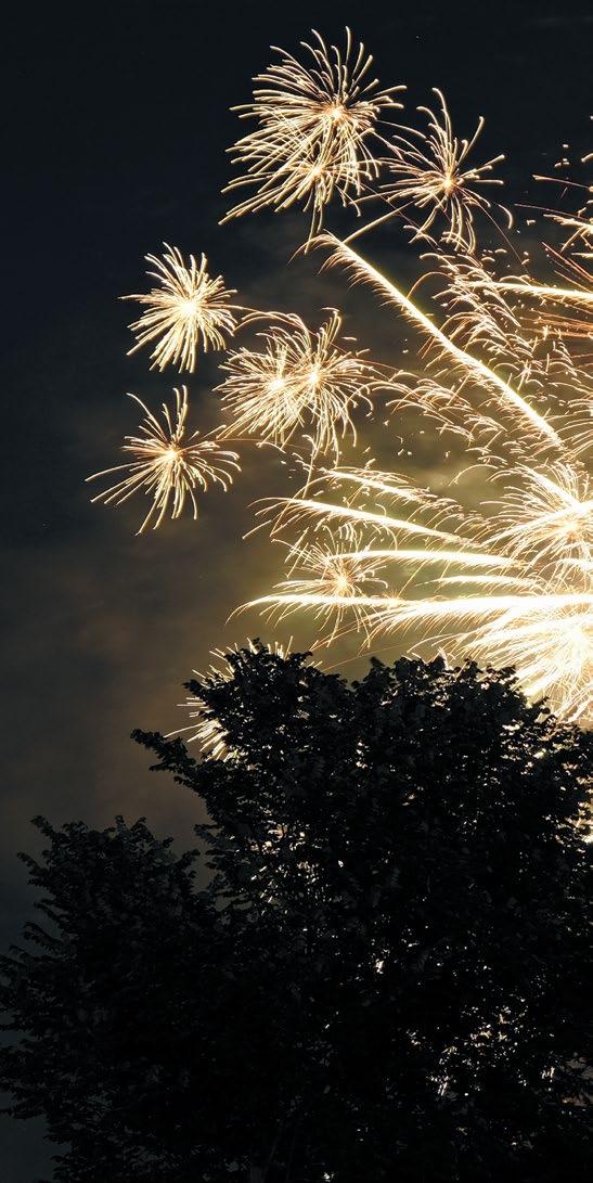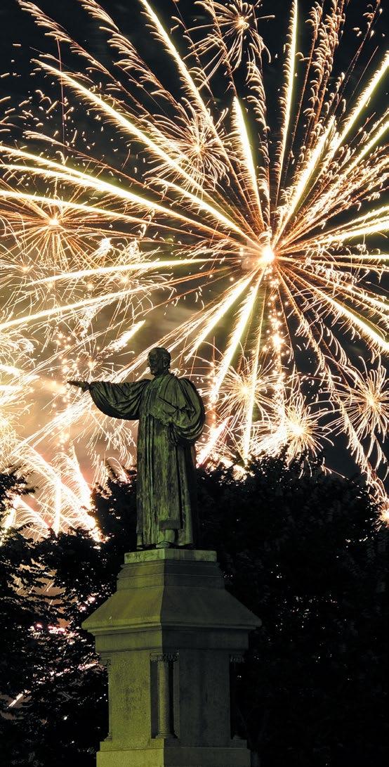 Showstopping fireworks illuminate the Main Quad’s statue of Trinity College founder Bishop Thomas Church Brownell during Reunion Weekend 2022. The Saturday evening light show capped a full day of Reunion events in addition to the pandemic-postponed 2020 Commencement ceremony. The festive feeling will continue through to next year, in May 2023, when the college kicks off its bicentennial celebration, Trinity at 200: Committed to the Future since 1823. For more on Reunion, please see page 10; for more on Commencement for the Class of 2020, please see page 4; and for more on the Bicentennial, please see page 7.
