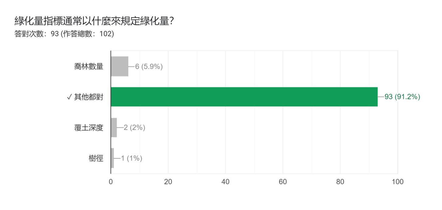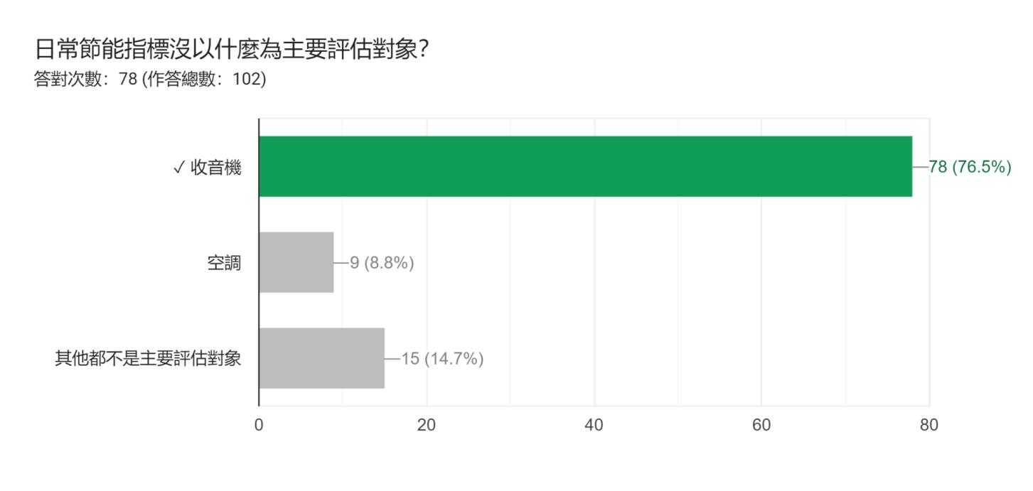 而答對率最低的一題是第 2 題,題目是綠化量指標是指在什麼所使用的能源而換 算出來的 CO2 排放量?我們推測是因為我們在簡報的資料中「不」這一個字標示得不 太明確,所以才會讓答對率少於 70 %,下次我們可以把重要的字標示得更清楚,才 不會讓人看錯。
