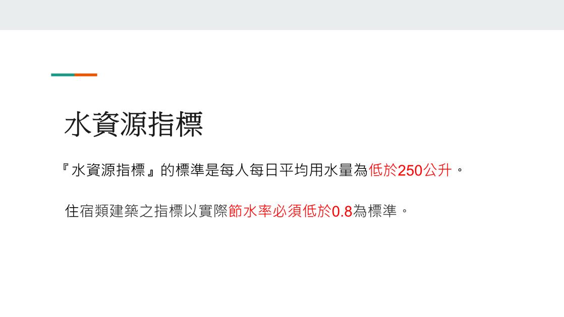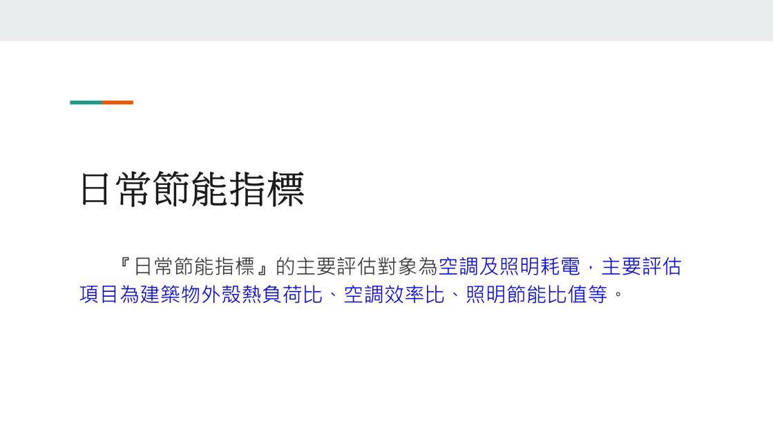 二項指標,成為現在大眾熟知的九大指標。台灣 EEWH 綠建築評估系統包括九大指標, 其中與溫室氣體直接相關的指標為「日常節能」、「溫室氣體減量」二項指標,唯各指