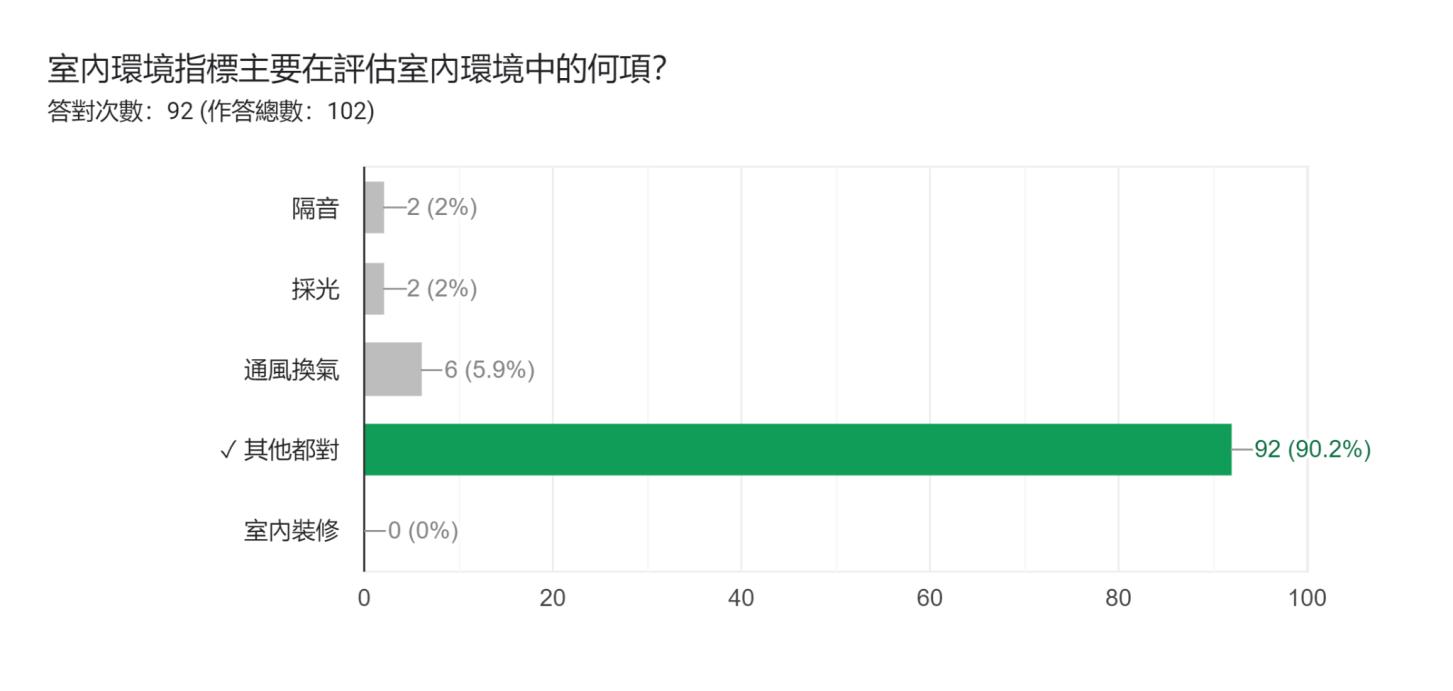 根據數據,這題答錯人數最高的是選項 3 通風換氣,可能是因為除了簡報標示不 清楚外,大家應該是看到【室內環境】就會想到通風換氣,所以這題答對率才會只有 在 90.2%。