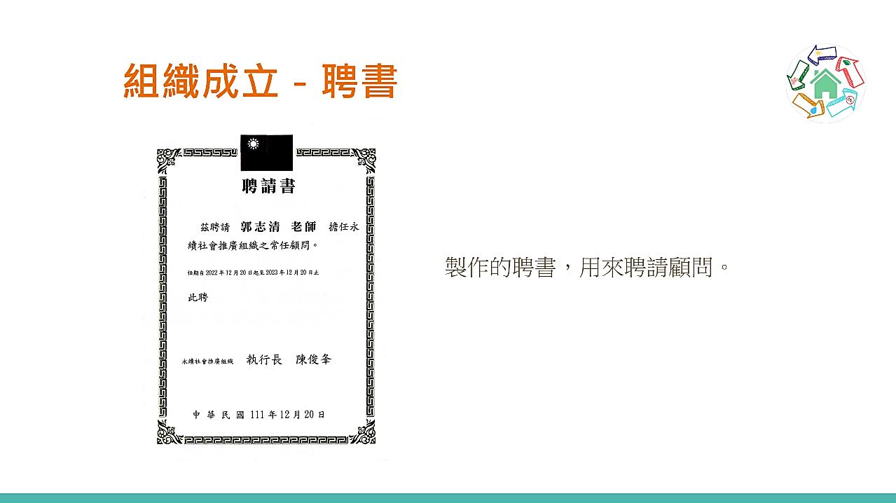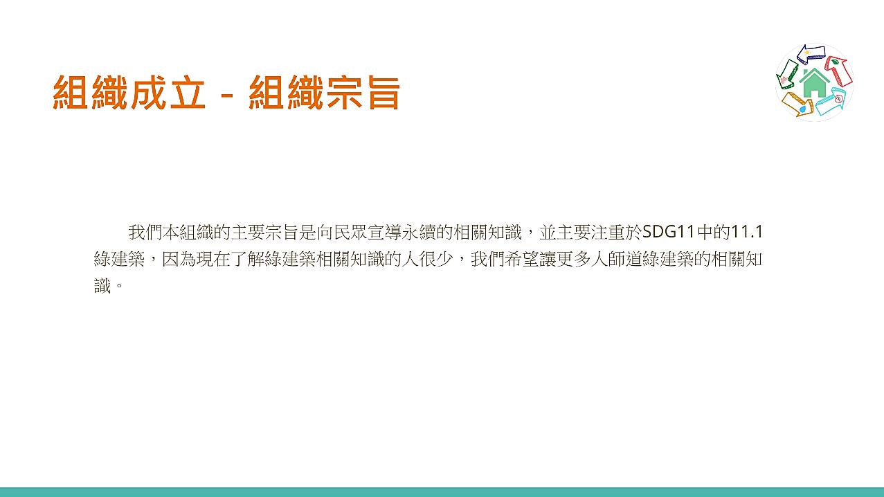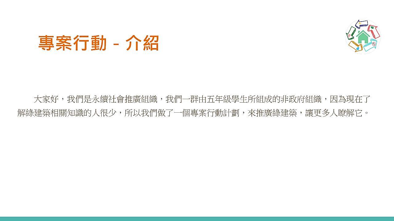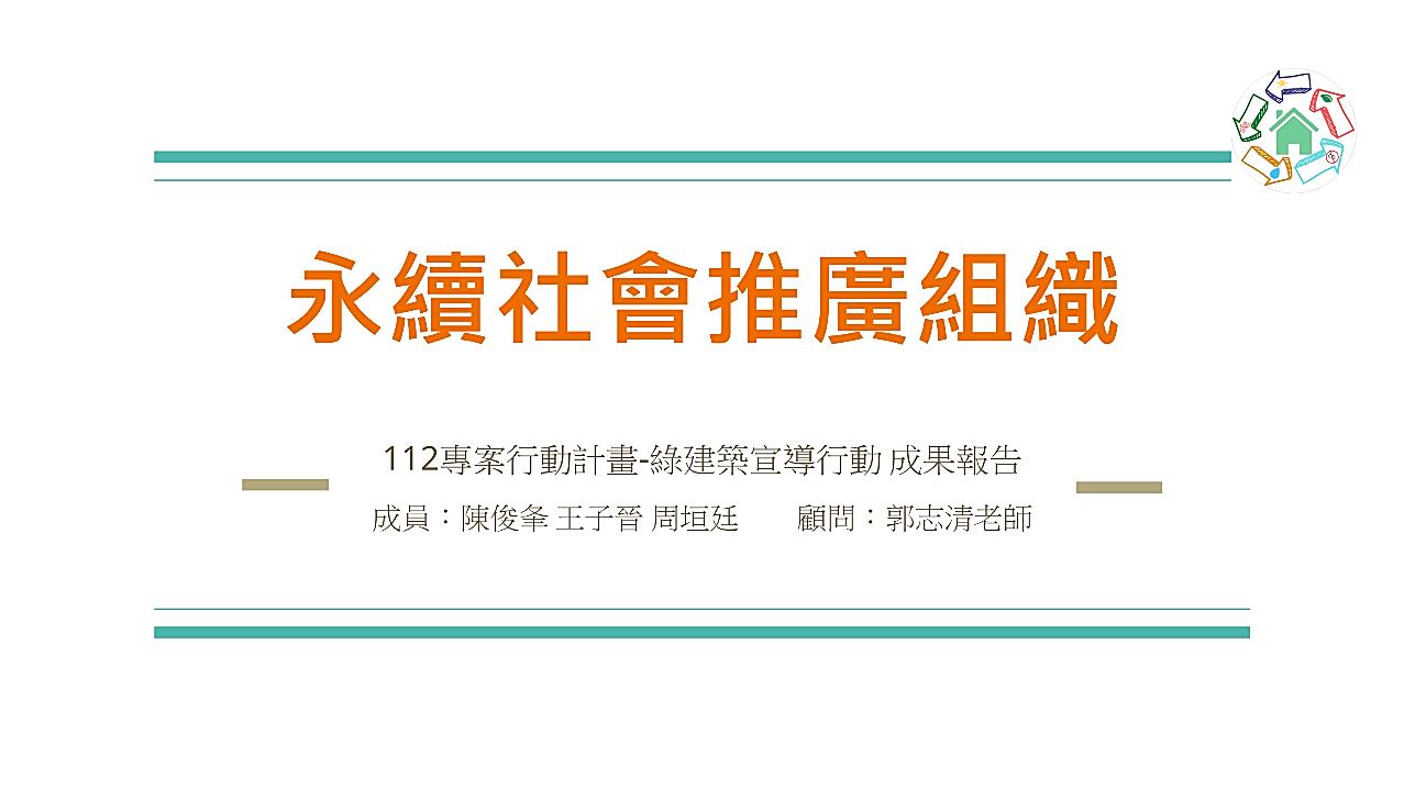 組織名稱|永續社會推廣組織 顧問|郭志清老師 專案名稱|綠建築推廣行動