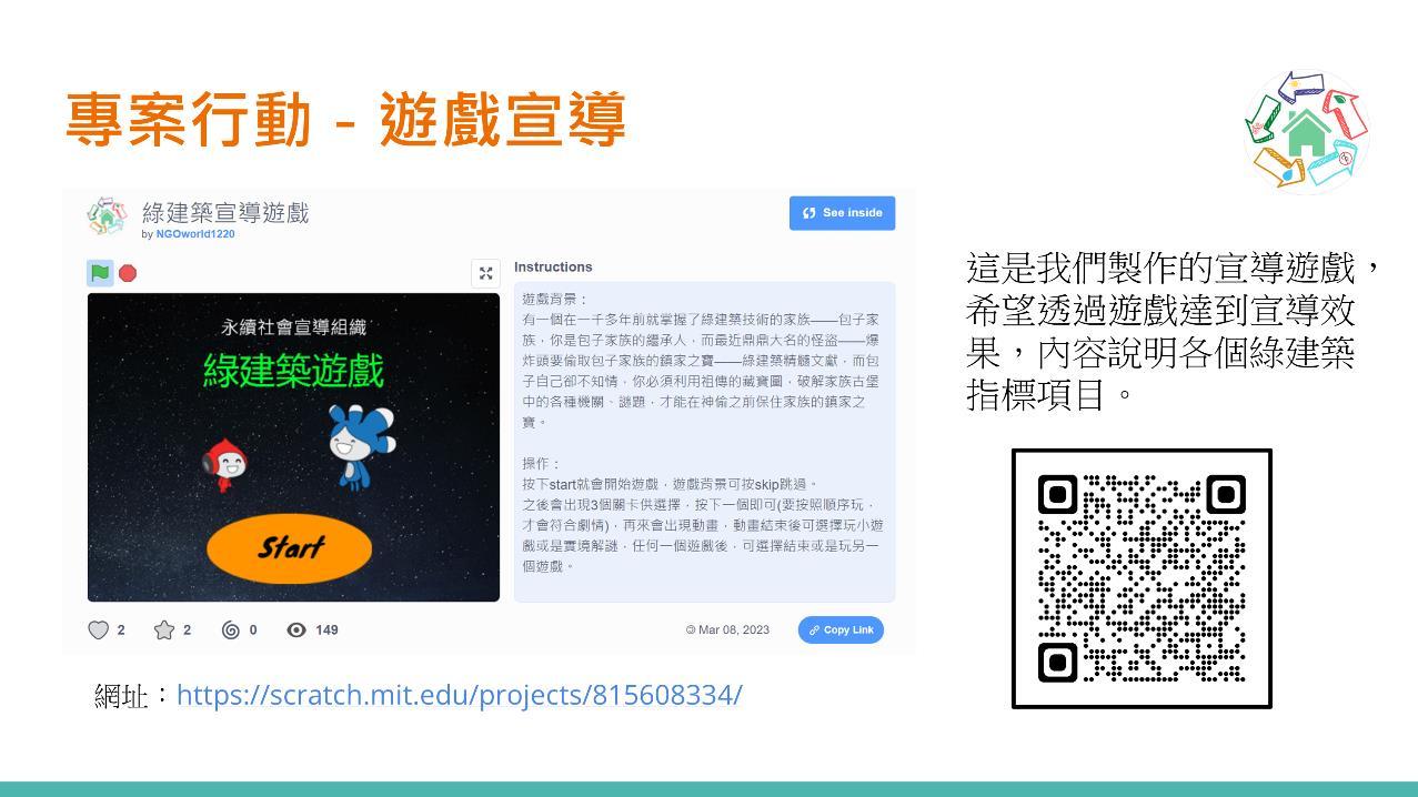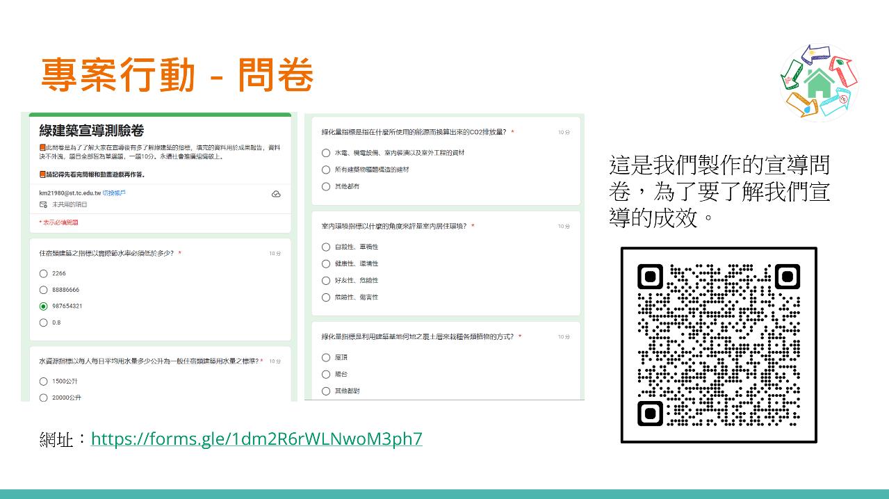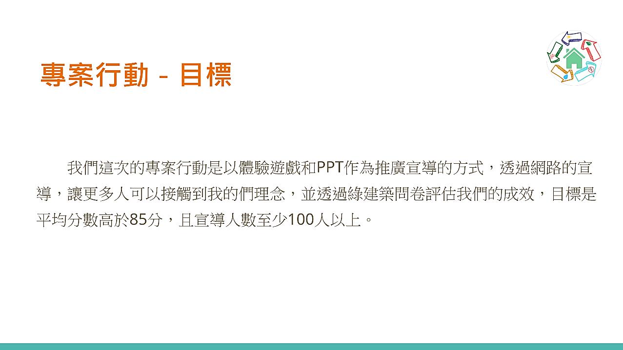 因為根據我們所見,綠建築在台灣不普遍,希望讓大家更了解有關於綠建築的指 標,所以我們成立了 NGO 組織,也製作了 NGO 的網站,網站裡面包含我們之前做 過的專案行動及這次的綠建築宣導行動。綠建築宣導行動是透過網路宣導綠建築的行 動,內容包含我們製作的推廣遊戲和簡報,最後透過問卷來驗證我們的宣導成效。最 後我們的成果是:有超過 100 人填寫我們的問卷,而且平均分數高於 85 分,達成我 們預期的目標。