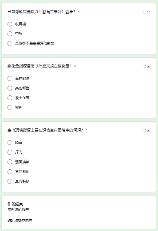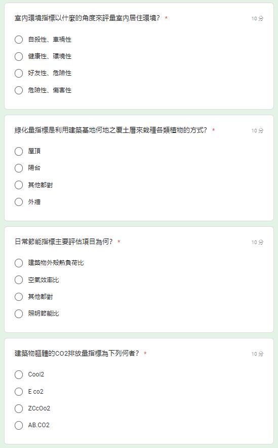⚫ 專題研究:以永續建築指標,進行校園建築空間體檢、並提出報告。