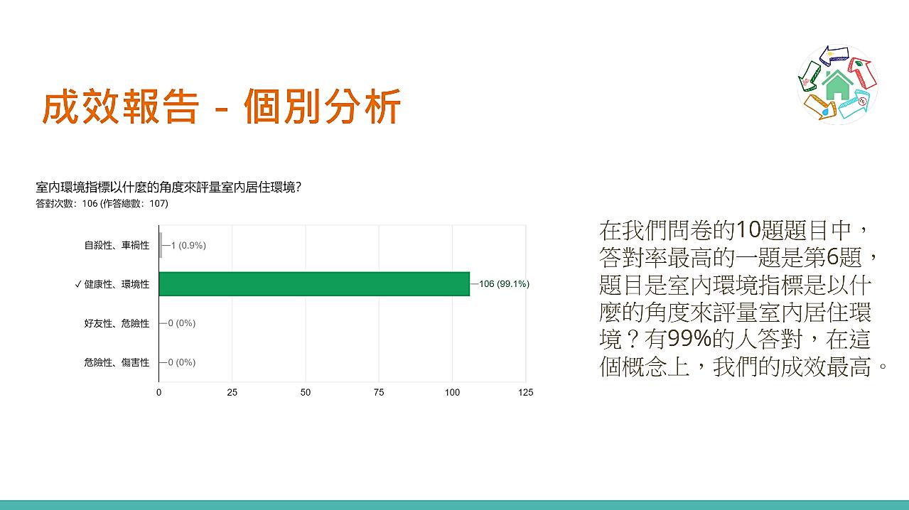 在我們問卷的 10 題題目中,答對率最高的一題是第 6 題,題目是室內環境指標 是以什麼的角度來評量室內居住環境?有 99%的人答對,在這個概念上,我們的成效 最高。