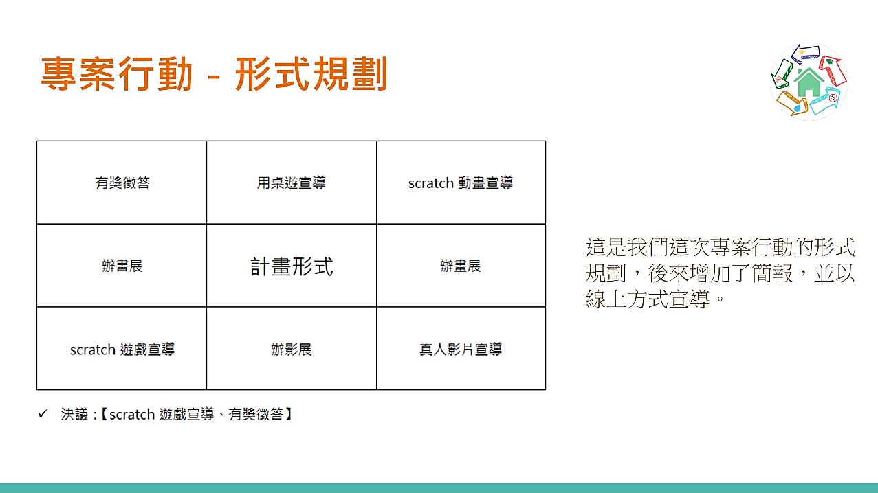 宣導遊戲 以各種方式製作宣導用的遊戲及動畫。 有時會不懂製作工具的功能。 宣導簡報 詳細介紹宣導內容。