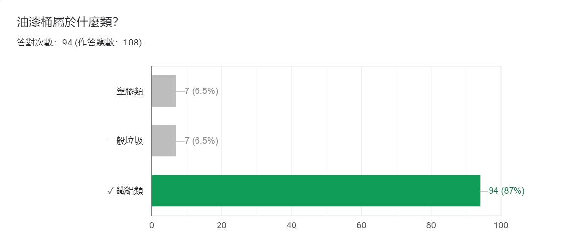 這題答對率高為 97.2%,只有 1 個人選紙類,2 個人選鐵鋁類等錯誤答案。