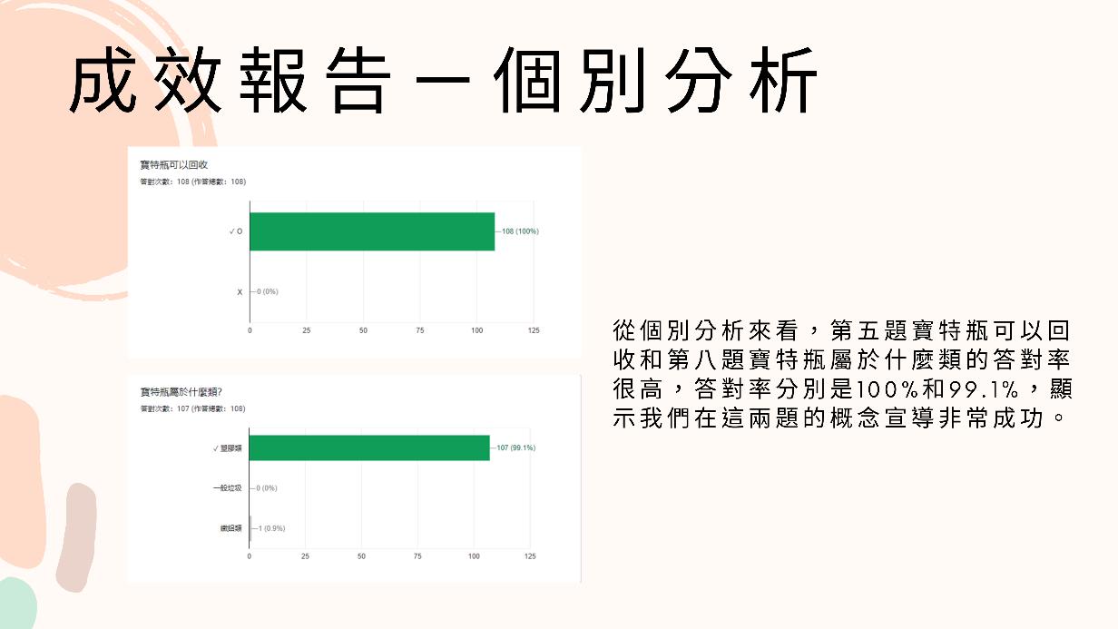 從個別分析來看,第五題寶特瓶可以回收和第八題寶特瓶屬於什麼類的答對 率很高,答對率分別是 100%和 99.1%,顯示我們在這兩題的宣導概念非常成