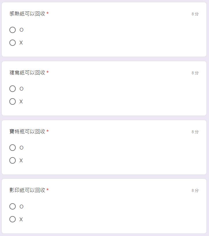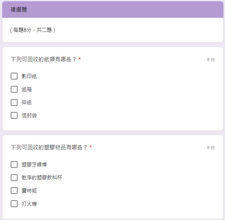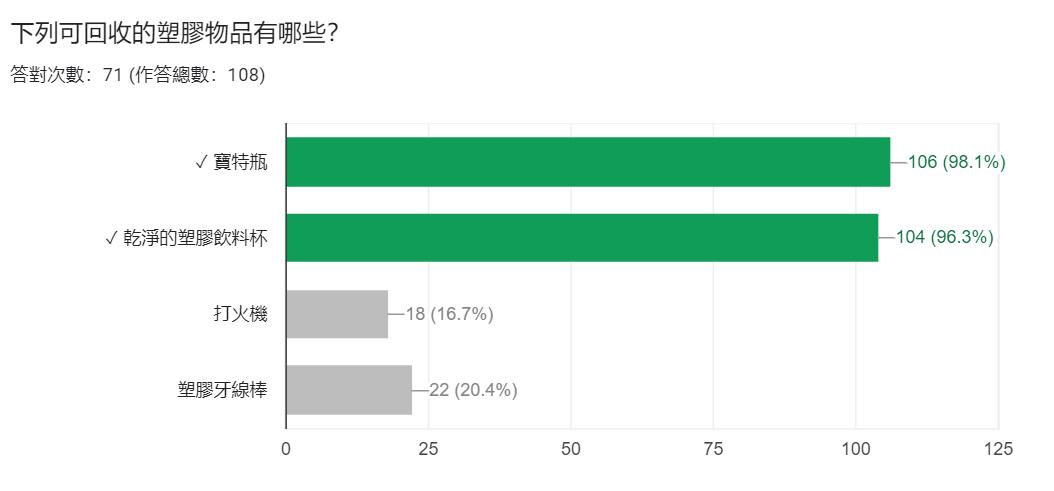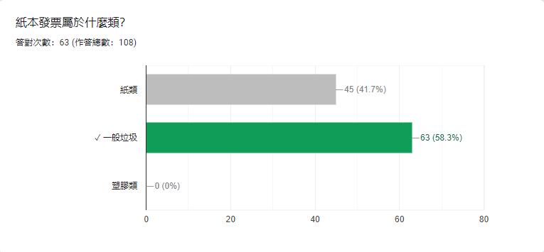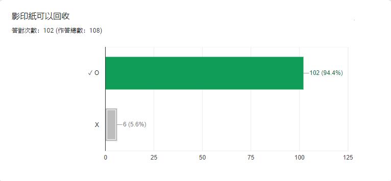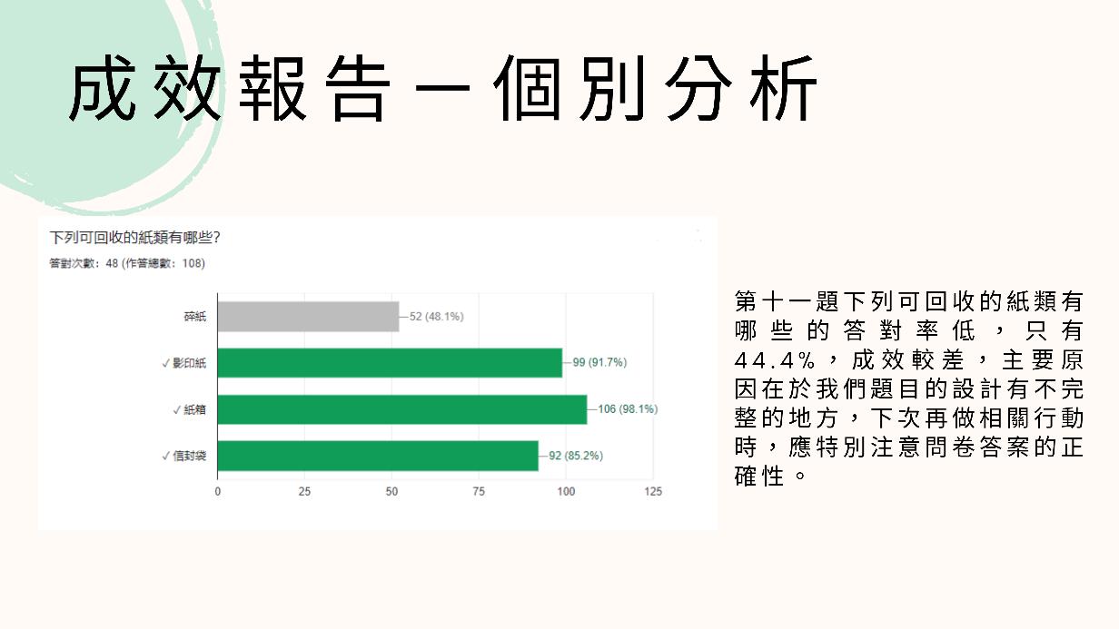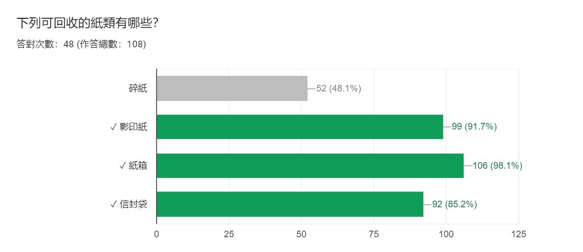我們發現這題的答對率偏低只有 44.4%,後來發現許多人都有選碎紙,經過搜尋 後,發現碎紙經過處理後也能回收,這次是我們出題上的錯誤,下次需改進。