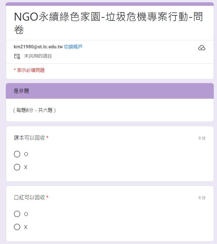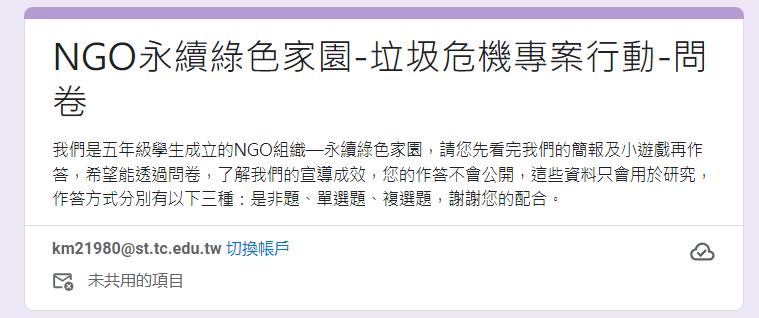 成立 NGO 組織後,推動垃圾危機專案計畫,透過網路宣導及線上桌遊活動,增 加人們的環保意識,減少垃圾的產生,以維護環境。專案計畫透過網路問卷收集數據 以了解成效,最後問卷的平均分數是 82.16 分,達成預期目標。