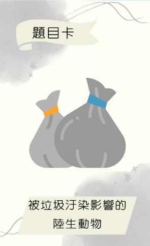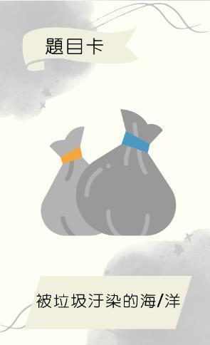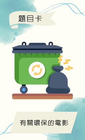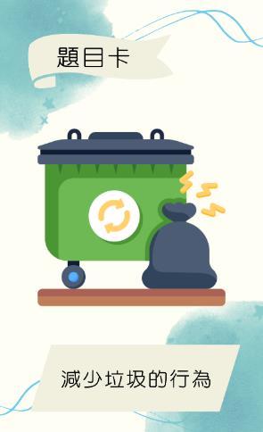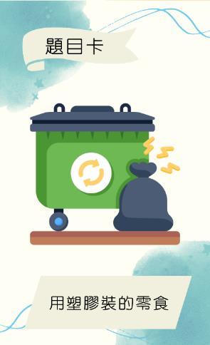 ⚫ 落敗一方須從題目卡中抽取5張牌 ⚫ 並用牌上的題目的相關內容講述一段有關環保的故事。