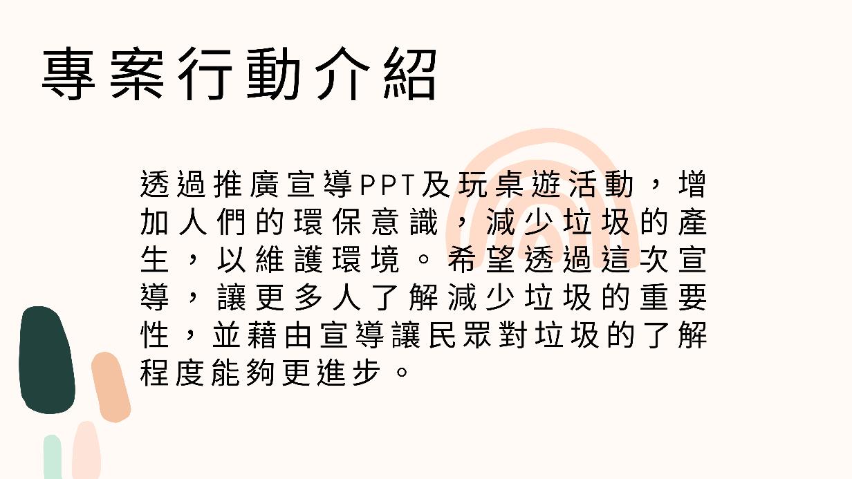1 希望透過這次宣導,讓大家了解減少垃圾的重要性。