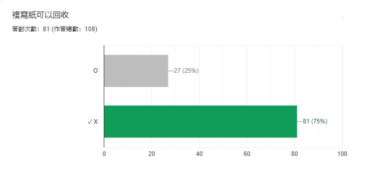 這題的答對率是 75%,共有 27 個人答錯,應該是複寫紙在生活中比較少見,也 可能是宣導不太成功,導致較多人答錯。