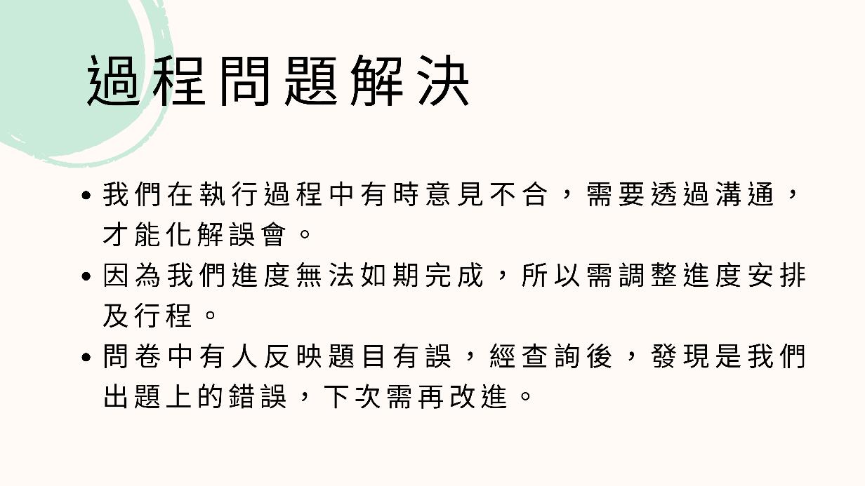 3.問卷中有人反映題目有誤,經查詢後,發現是我們出題上的錯誤,下次需再改進。 六、行動執行成果