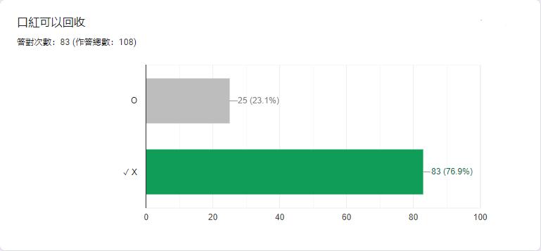 這題的答對率是 76.9%,共有 25 個人答錯,應該是因為大家對口紅認知不夠, 加上宣導可能不太成功,導致較多人答錯。