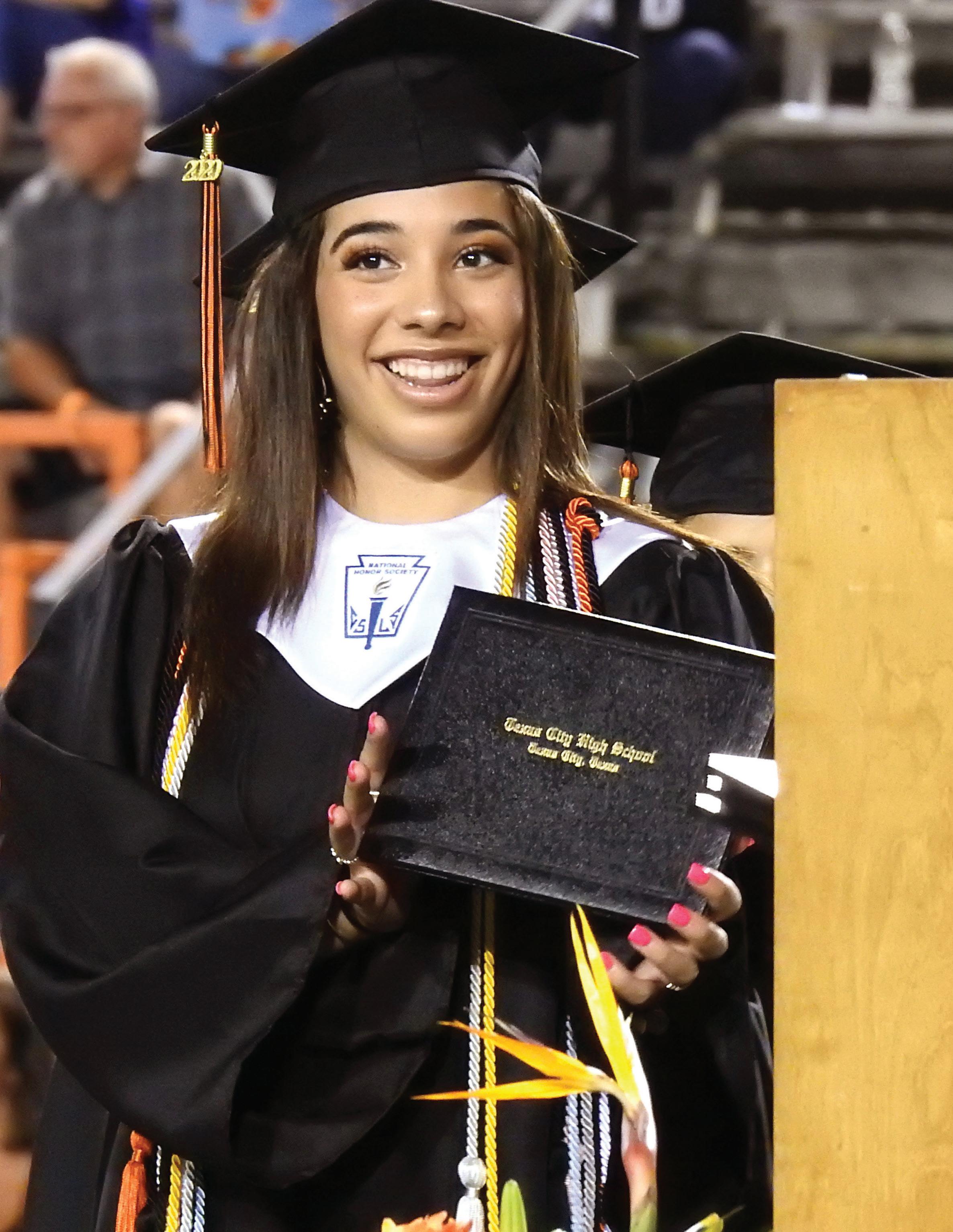 Mykenzie Gorom holds up her cap and gown at the TCHS Senior Night parade.