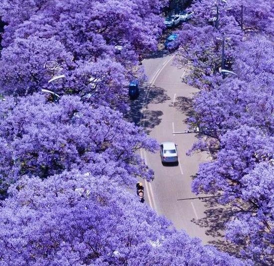 • 於昆明教場中路賞藍花楹,這裡是經典的藍花楹打 卡勝地,也是藍花楹最密集的地方,當花盛開之時, 像為這條街道灑上一層紫藍調顏料,絕美。