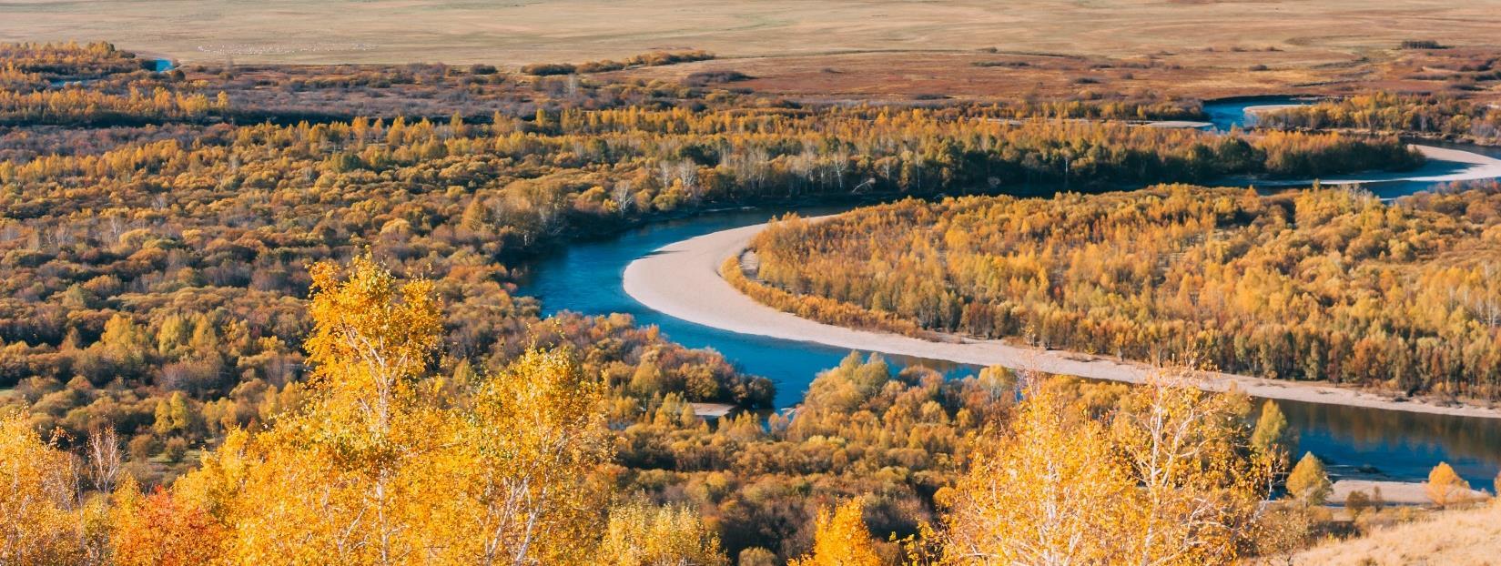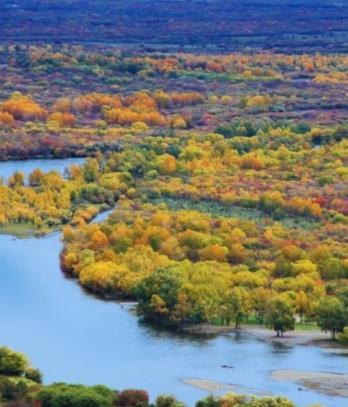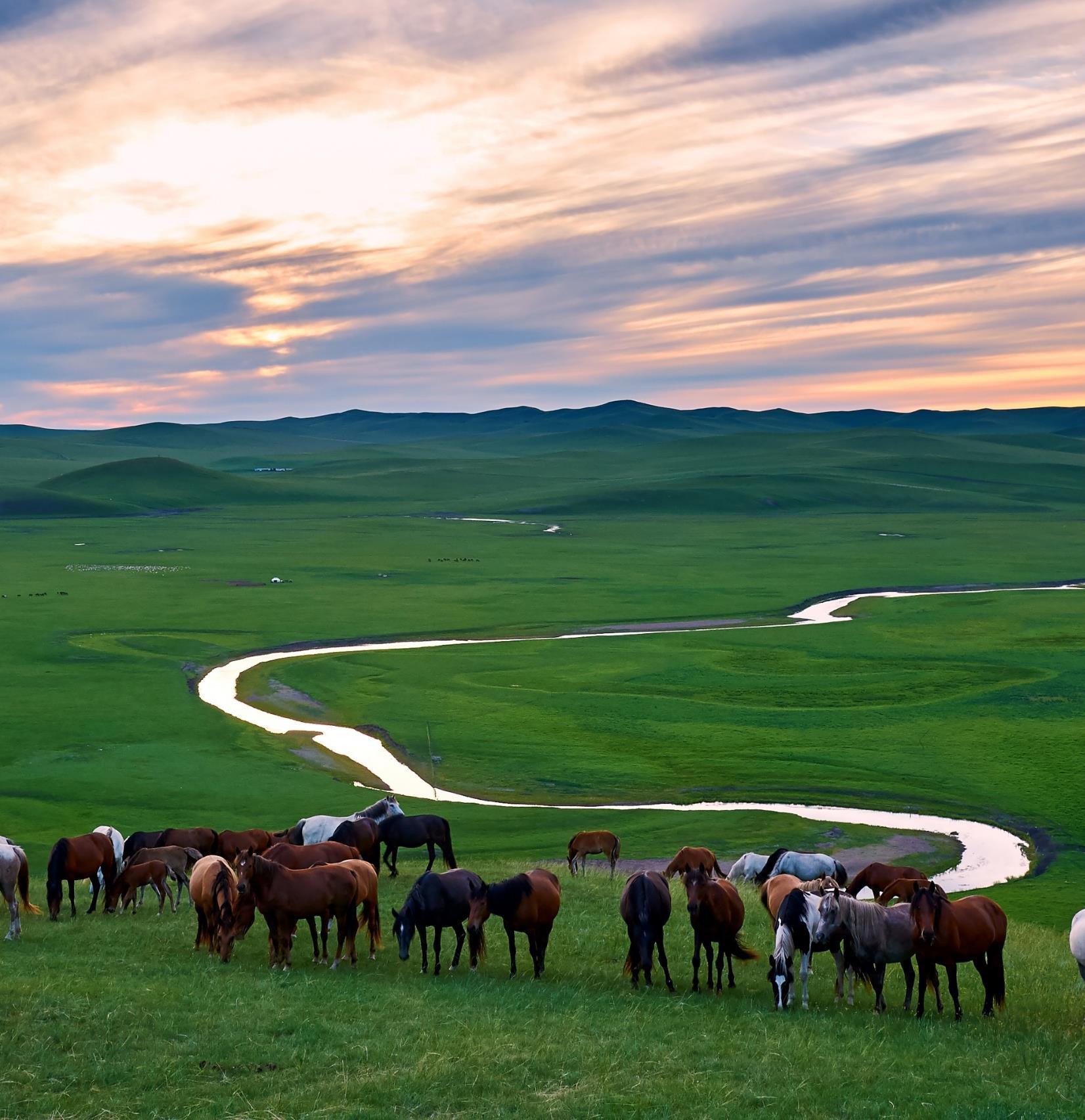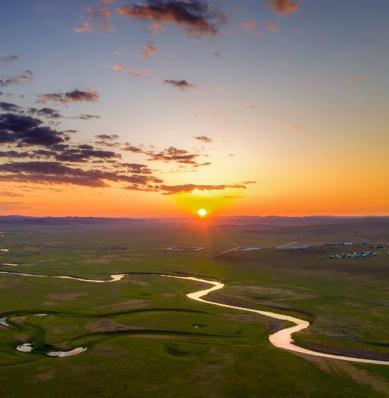 旅途中可盡情擁抱「風吹草低見牛羊」的內蒙古大草原:位 於內蒙古呼倫貝爾市的額爾古納濕地,是由多條河流交匯形 成的平原濕地,總面積超過1,260平方公里,擁有超過400種 植物、260多種動物,是中國原生態保存最完好、面積最大 的濕地。莫爾格勒河被譽為「天下第一曲水」,河道蜿蜒曲 折,在草原上形成獨特的景觀,河水清澈,周邊草原遼闊, 牛羊成群,構成如詩如畫的美景,草原與河水的自然色調隨 四季更迭,夏日原野翠綠、秋天金黃絢麗。