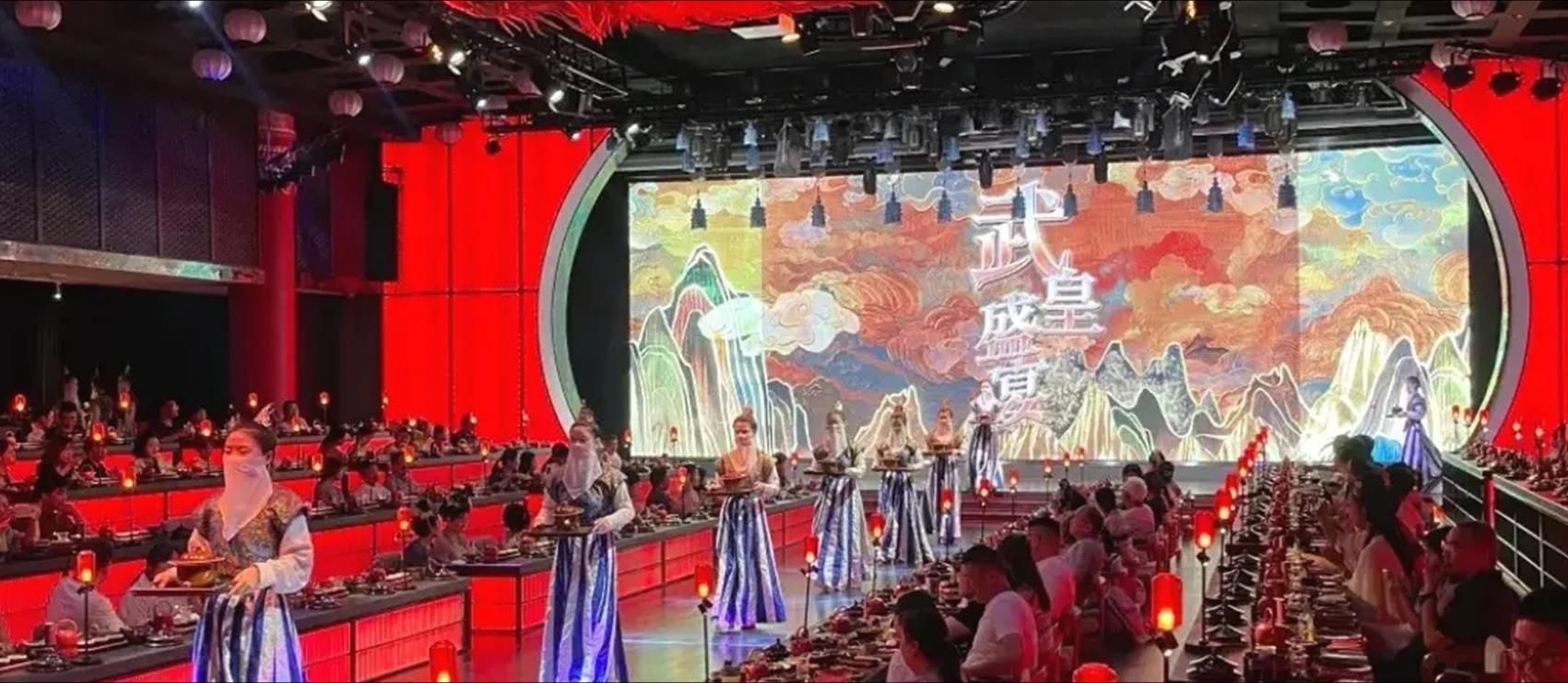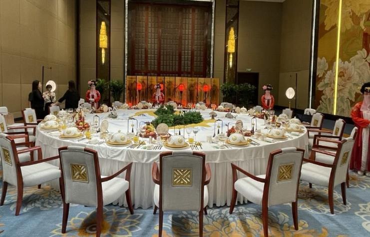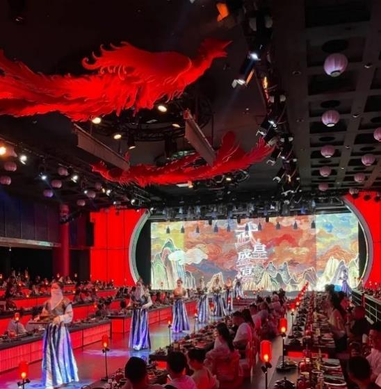 唐宮·樂宴 – 唐文化主題高級宴會餐廳 千年古都,尋鑒唐宴,唐宮樂宴帶您夢回盛唐。餐廳的 高端系列主打沉浸式唐文化用餐體驗,餐點一道一道按 順序上菜,菜色精美,擺盤考究,餐桌大氣磅礴,搭配 各類唐朝裝飾,服務人員均身著唐裝在旁,髮髻高高挽 起,席間優美的伴樂更是將宴席升華,絲竹聲聲,千迴 百轉,富麗堂皇的唐朝風格裝潢伴隨著唐樂悠悠傳來, 瞬間帶您感受那千年前盛唐風華。
