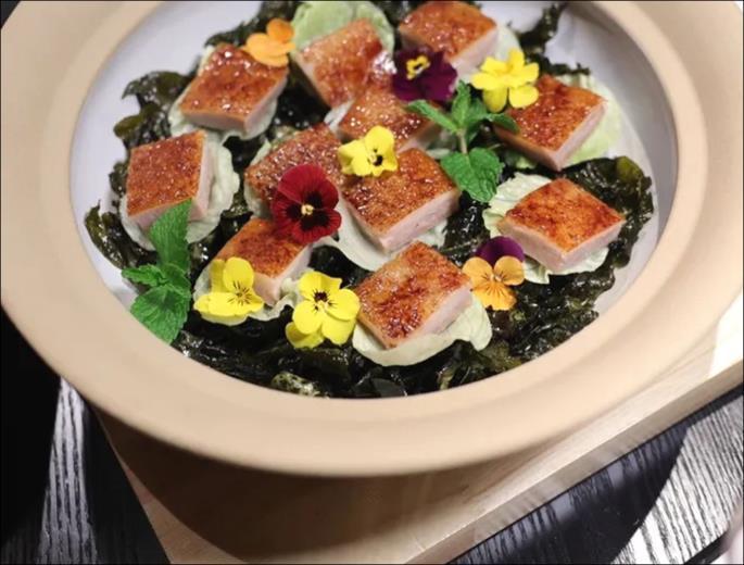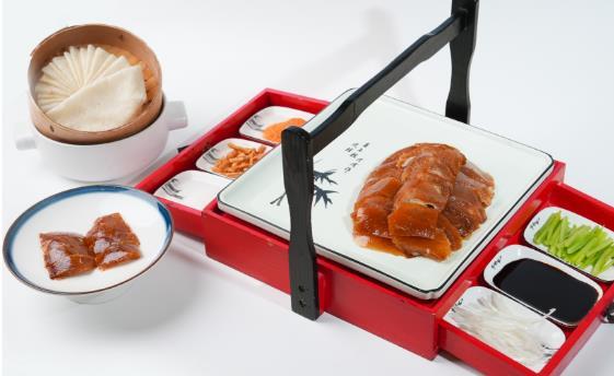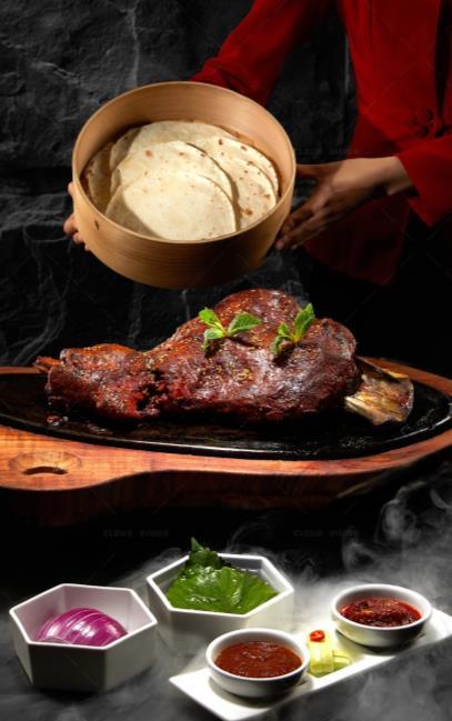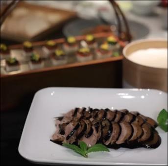 主打招牌烤鴨,琥珀色鴨皮酥脆得像冰糖葫蘆的糖衣, 鴨肉浸潤著關中人鍾情的香料尾韻,一咬如碎盛唐琉璃 瓦,肉香裏漾著唐代食譜天書《燒尾宴食單》的餘韻, 是周秦漢唐的庖廚智慧。長安自古帝王氣,十三朝炊煙 在此凝成盤中風物,既有家鄉味的熨帖,又帶著盛唐宴 飲的考究,當商務高級宴遇上陝菜,用舌尖丈量千年長 安的厚度,彷彿有雁塔晨鐘在碗碟間迴響,是與長安的 對弈,箸尖挑起的是家常,落下的卻是文化的樂譜。