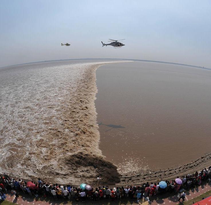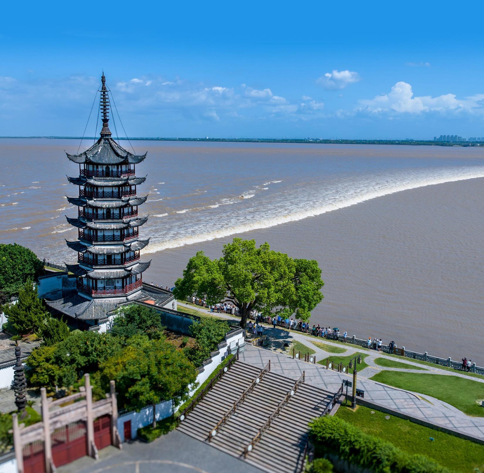 「八月十八潮,壯觀天下無。」海寧觀潮是錢塘江大潮的 重頭戲,每年農曆八月十八因月球引力最強,加上河口外 寬內窄的特殊地形,形成規模最大的「天文大潮」。特別 安排海寧觀潮勝地公園的觀潮樓冷氣包廂,一人一座舒適 地觀賞農曆八月十八錢塘江最大潮,VIP級享受。