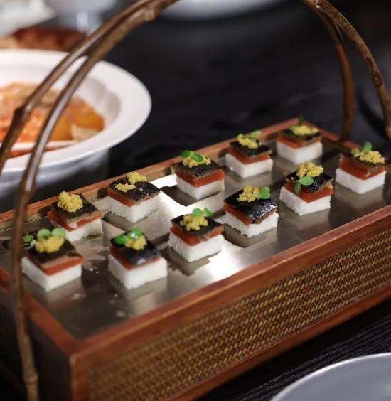 隆慶居 – 與興慶宮輝映的宮廷融合菜 隆慶居中式古典園林景觀酒店毗鄰昔日皇家園林 興慶 宮公園,這裡曾是唐玄宗李隆基的舊宅,也是他與愛妃 楊玉環長期居住的地方,更是您體驗皇家園林風情的絕 佳之地。酒店園林設計汲取了興慶宮的古典之美,亭臺 樓閣、小橋流水,每一處都透露著濃郁的唐代風情。在 這裡,您可以漫步於沉香亭旁,感受李白筆下的「花萼 相輝樓」,彷彿能聽到古琴聲聲,看到霓裳羽衣舞,能 品嚐到國宴唐宴的融合菜品。廚師團隊以傳統唐宴為靈 感,結合現代烹飪技藝,為您帶來一場味覺與視覺的雙 重盛宴。 美饌珍饈