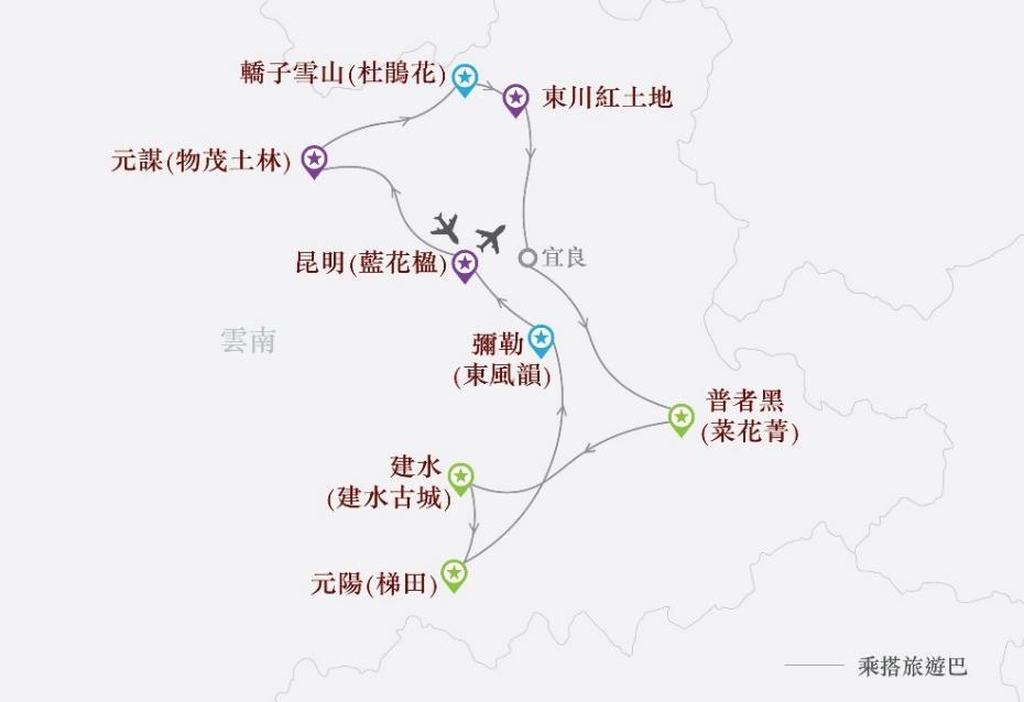 暢遊:昆明(藍花楹)、元謀(浪巴鋪土林)、轎子雪山(杜鵑花)、東川紅土地、 普者黑(菜花菁、雙甲碼頭日落、青龍山觀日出、普者黑景區)、建水 (建水古城、建水米軌小火車、雙龍橋、鄉會橋、團山村)、元陽(哈 尼梯田,壩達梯田日落、多依樹觀日出、愛春藍色梯田、壩達景區、 箐口哈尼民族村)、彌勒(東風韻、錦屏山大佛)