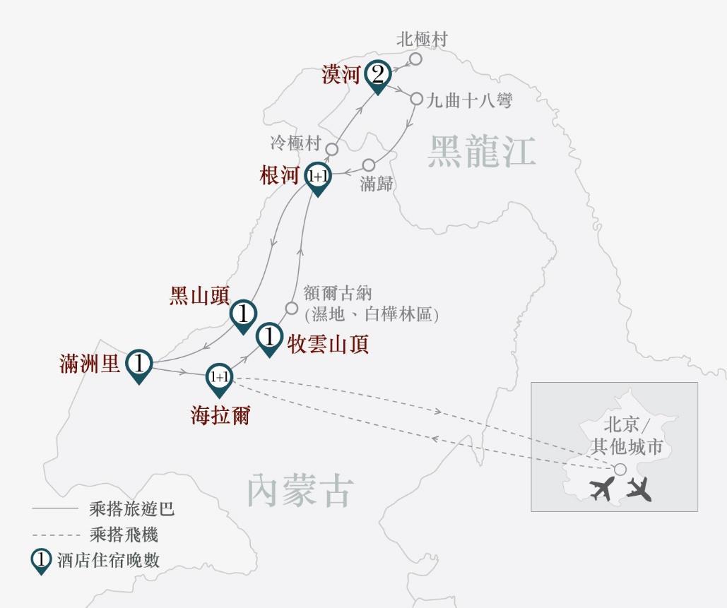 暢遊:內蒙古(呼倫貝爾[海拉爾、莫爾格勒河景區、牧雲山頂、額爾古納濕地、 根河、冷極村、布東霞馴鹿部落、滿歸、滿洲里、呼倫湖、黑山頭、 巴爾虎])、黑龍江(漠河)
