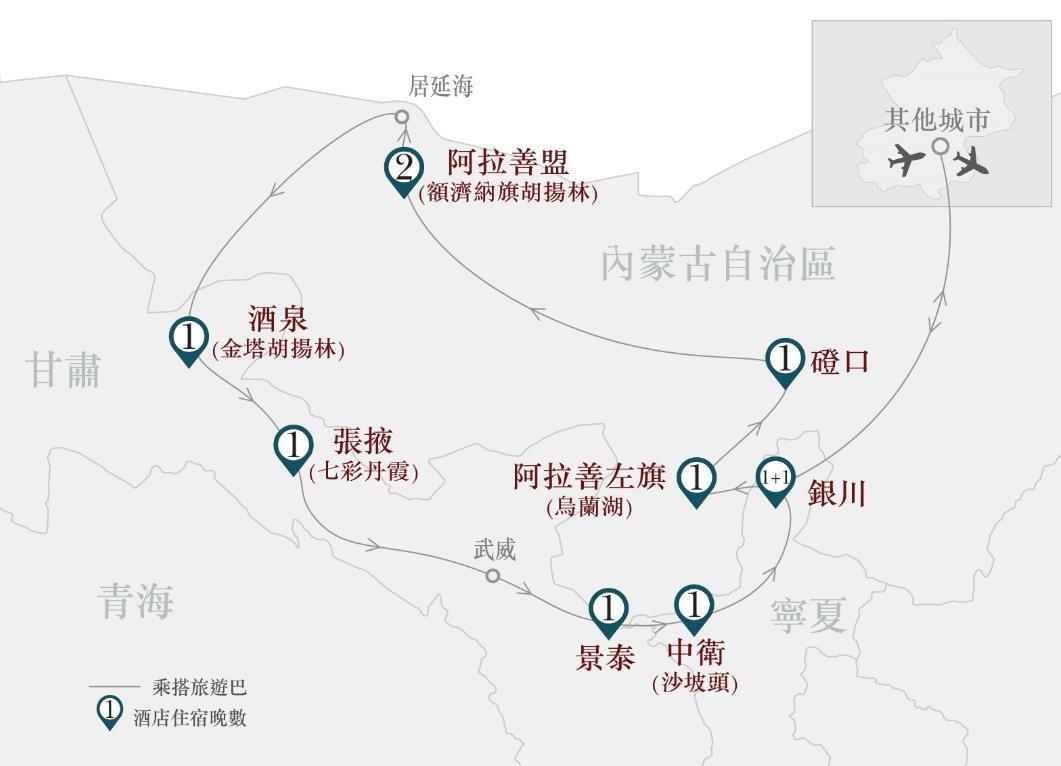 暢遊:銀川(西夏王陵、西夏博物館、賀蘭山岩畫)、阿拉善左旗(烏蘭湖、 西部夢幻大峽谷、納林湖景區、騰格里大漠)、阿拉善盟額濟納旗 (黑城弱水胡楊林景區、黑水城、額濟納胡楊林、居延海)、酒泉(金 塔胡楊林)、張掖(七彩丹霞地質公園)、武威(文廟、天梯山石窟)、 中衛(黃河石林國家地質公園、通湖草原、沙坡頭)