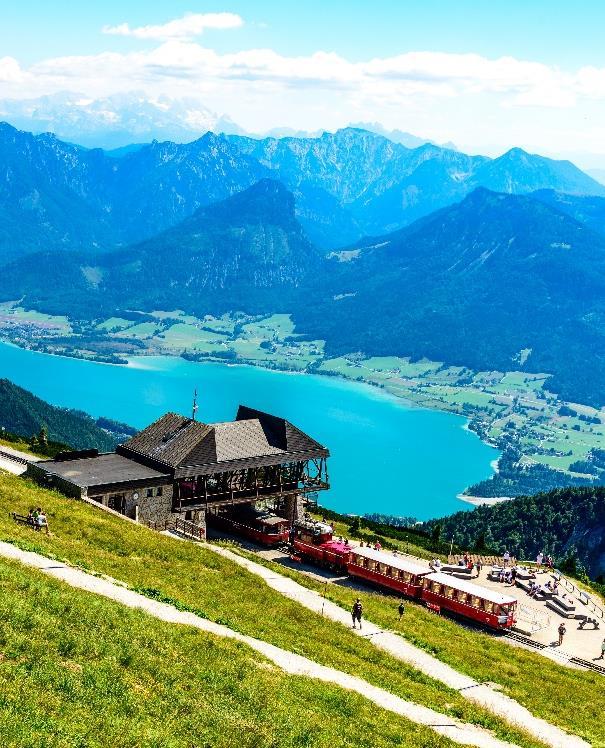 • 於聖沃夫岡乘奧地利乘百年火車登夏夫堡,這條懷 舊老式齒軌火車鐵路,是於1893年投入運作,以 蒸汽驅動火車運載乘客登上1700多米高峰的鐵路, 居高臨下,沿途可觀賞到聖沃夫岡湖及阿爾卑斯山 秀麗景色,令人沈醉。