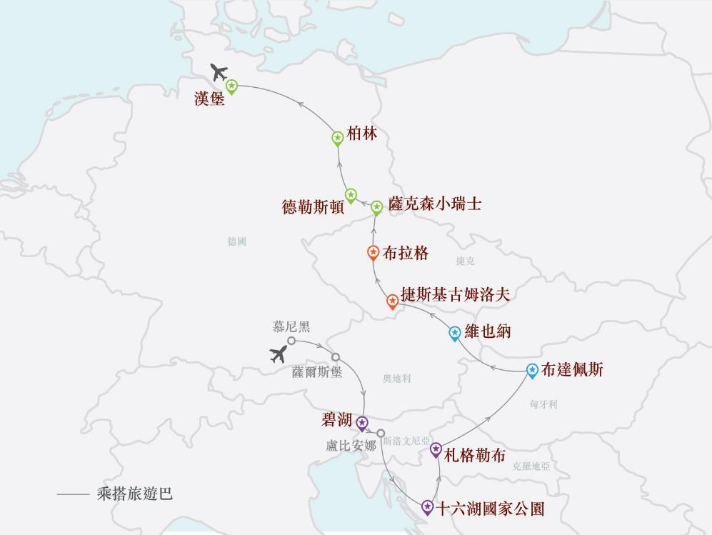 暢遊: 薩爾斯堡、碧湖、盧比安娜、十六湖國家公園、札格勒布、布達佩斯、 維也納、捷斯基古姆洛夫古城、布拉格、薩克森小瑞士、德勒斯頓 、 柏林、漢堡