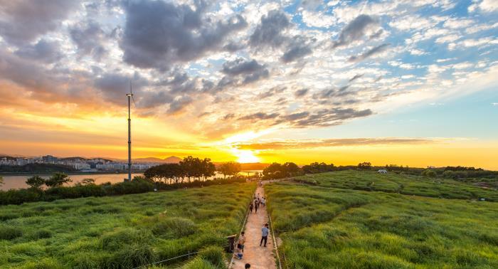 整座公園採方形設計,分為紫芒種植地、混合草地區、 岩石園、混生草地、向日葵種植地等不同主題區。在展 望台上,漢江壯闊的景色將一覽無遺地盡顯眼前,成為 拍攝這遼闊景致的熱門攝影地。