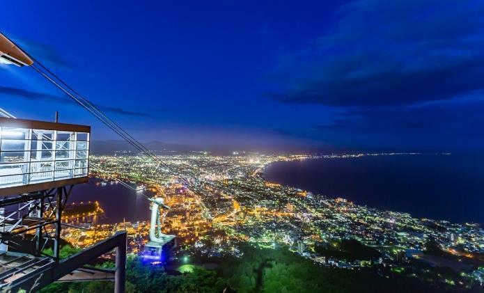 從函館山眺望世界三大夜景之一的函館山夜景,曾被評選 為米芝蓮三星景點。兩側對稱海灣岸線,像一片璀璨無比 的夜明珠,散落在函館市每個角落。