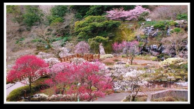 以「日本第一早開梅」聞名,建於明治19年(西元1886年) 是日本最古老的梅花園,約60個品種株的梅樹,按照各自花 期依序綻放,當中更有樹齡超過百年的古梅樹。每到花祭, 綴滿一樹的雪白、艷紅、鮮黃、粉紅,鋪天蓋地的花海,使 得園內充滿梅花香。園內小橋流水還有木橋橫跨其中,增添 一層迷人的古韻,當微風及香氣飄開來時更是詩意萬千。