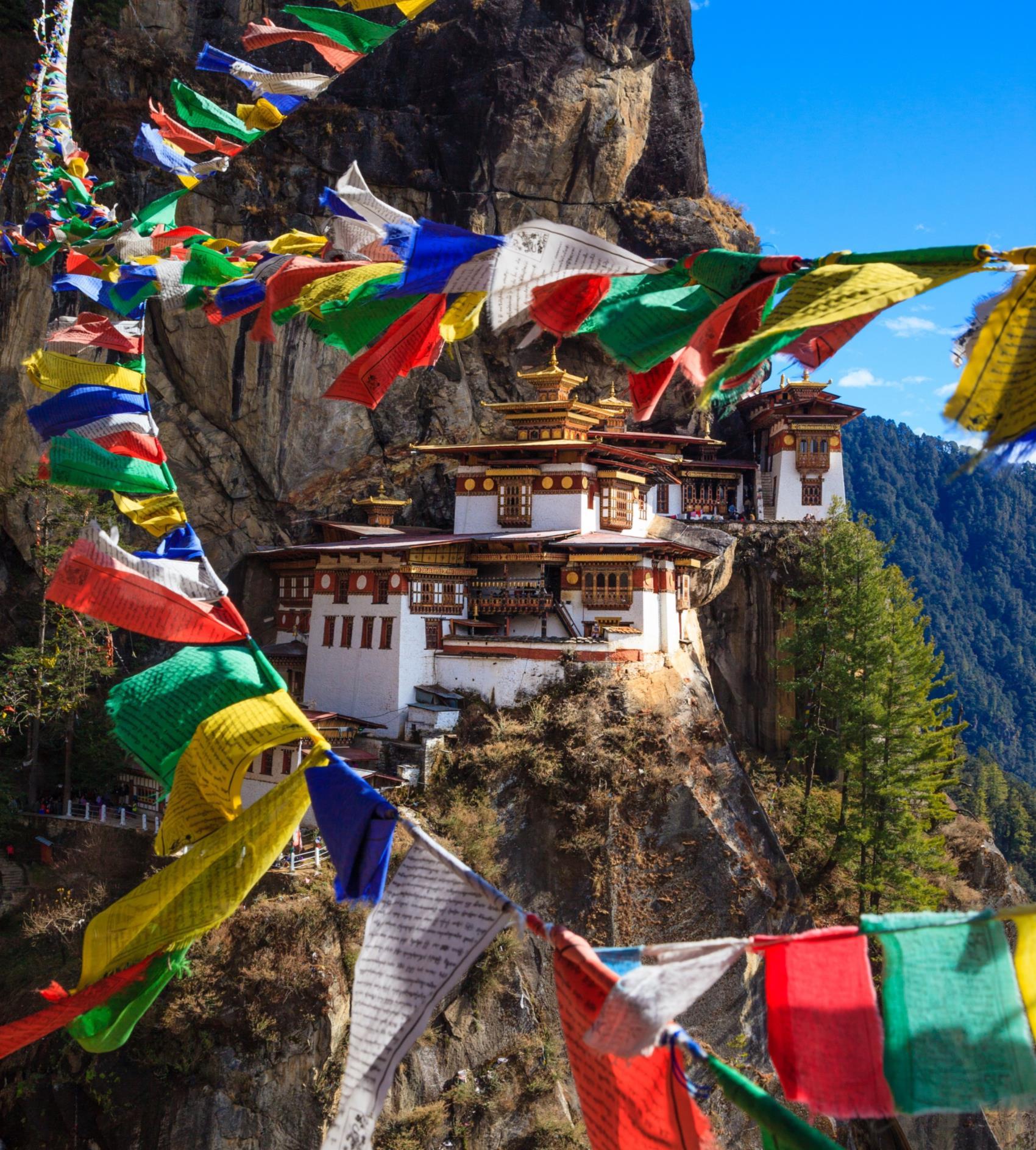 虎穴寺 特別安排騎馬登上半山處,再健行 往虎穴修道院,沿途可欣賞溪谷的 優美景致。這座世界十大寺廟之一 的虎穴寺,懸空於帕羅峽谷700多 米的懸崖峭壁之上,是不丹國內最 神聖的地方之一。