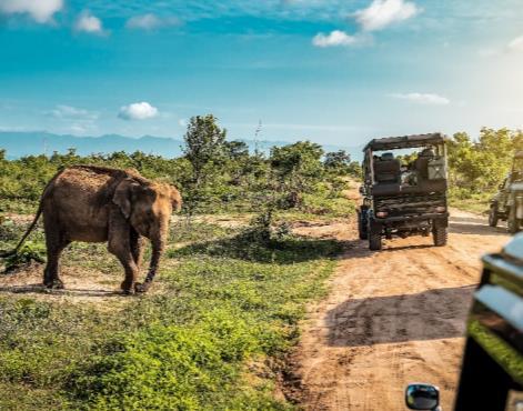 乘坐吉普車尋找野生動物蹤跡, 清晨或傍晚時分,大部分動物都 會到處出動覓食,通常最容易看 到梅花鹿、水牛、孔雀、蜥蜴及 各種鳥類等,在水源附近也能看 到鱷魚和大象等。