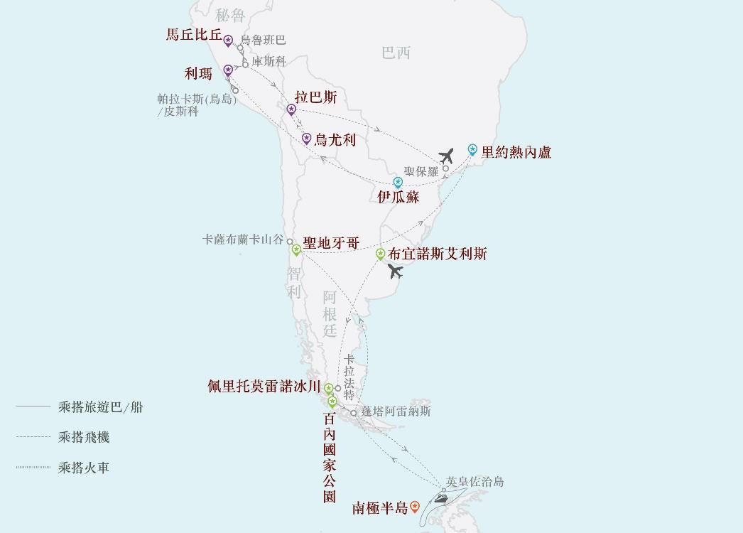 暢遊:阿根廷(布宜諾斯艾利斯、卡拉法特、佩里托莫雷諾冰川)、智利(聖 地牙哥、復活節島、蓬塔阿雷納斯、百內國家公園)、秘魯(利瑪、庫 斯科、烏魯班巴、馬丘比丘古城)、玻利維亞(拉巴斯、烏尤尼) 、巴 西 (聖保羅、里約熱內盧、伊瓜蘇大瀑布) 33天