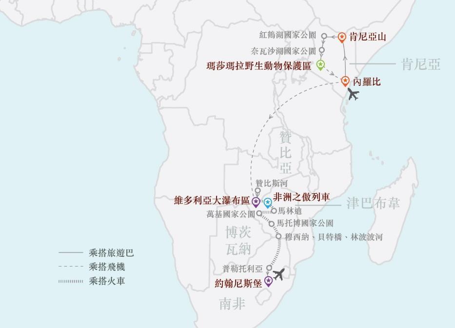 暢遊:肯尼亞(內羅比、肯尼亞山甜水保護區、紅鶴湖、瑪莎瑪拉)、津巴布韋(維 多利亞大瀑布、萬基野生動物保護區)、南非(普勒托利亞、約翰尼斯堡)