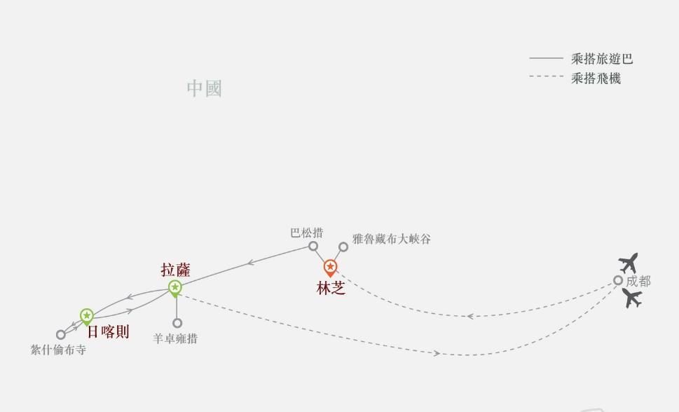暢遊: 成都、林芝(雅魯藏布大峽谷、色季拉山觀景台、世界柏樹王園林、魯 朗林海 ) 、 巴松措 、 拉薩 ( 布達拉宮 、 大昭寺 、 八廓街 、 西藏博物館、色拉寺、大昭寺廣場[一年一度燃燈節慶典])、日喀則(紮 什倫布寺)、羊卓雍措 10天