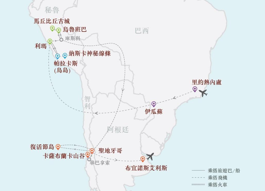 暢遊:阿根廷(布宜諾斯艾利斯)、南極半島、智利(聖地牙哥、蓬塔阿雷納 斯)、巴西 (聖保羅、里約熱內盧、伊瓜蘇大瀑布)