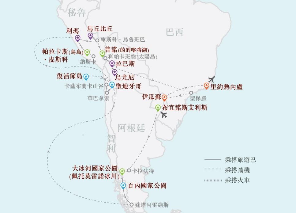 暢遊:阿根廷(布宜諾斯艾利斯、卡拉法特、佩里托莫雷諾冰川)、南極半島、 智利(聖地牙哥、蓬塔阿雷納斯、百內國家公園)、巴西(里約熱內盧、 伊瓜蘇大瀑布)、秘魯(利瑪、庫斯科、烏魯班巴、馬丘比丘古城)、 玻利維亞(拉巴斯、烏尤尼) 35天