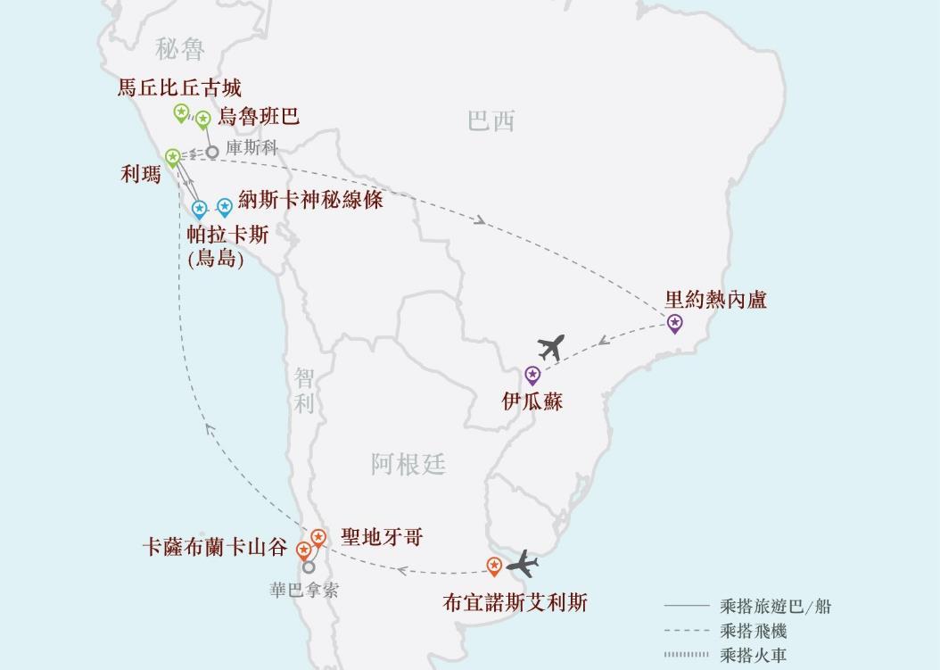 暢遊:阿根廷(布宜諾斯艾利斯)、智利(聖地牙哥、卡薩布蘭卡山谷、華 巴拿索)、秘魯(利瑪、烏魯班巴、馬丘比丘古城、庫斯科、帕拉 卡斯、納斯卡神秘線條)、巴西(里約熱內盧、伊瓜蘇大瀑布) 19天