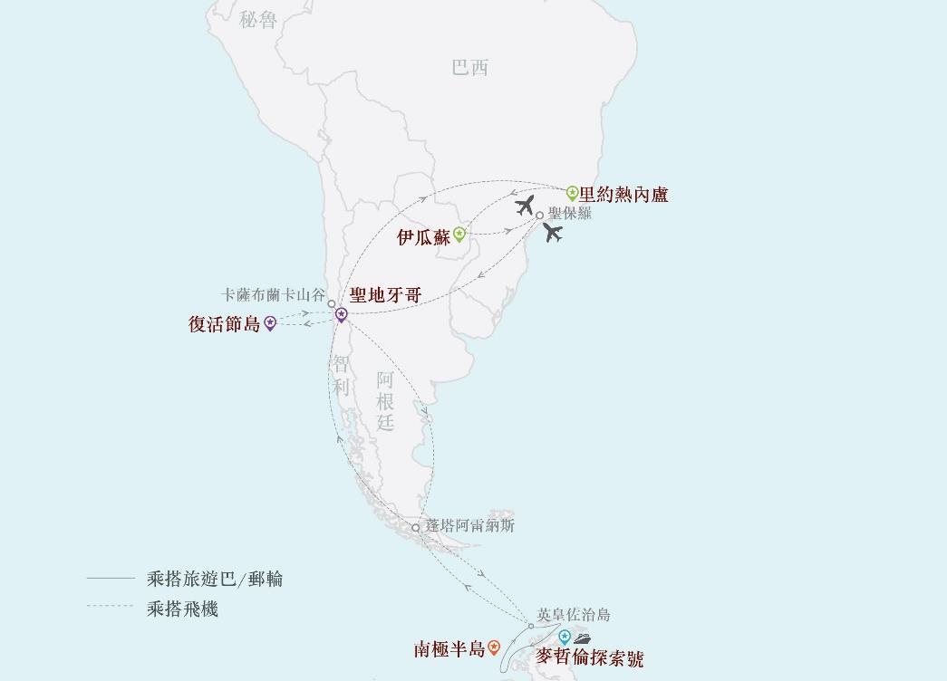 暢遊:南極半島、智利(聖地牙哥、復活節島、蓬塔阿雷納斯)、 巴西 (聖保羅、里約熱內盧、伊瓜蘇大瀑布)