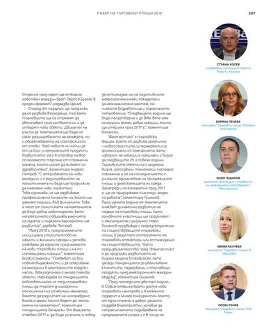 Отделно през март ще отворим собствен магазин Sport Depot в Бургас в среден формат”, разказва Цонов. Според dm пазарът ще продължи да се развива възходящо, тъй като търговците ще се стремят да увеличават присъствието си и да отварят нови обекти. Двигател на ръста за компанията ще бъде не само разширяването на мрежата, но и обогатяването на портфолиото от стоки. “Най-новите ни линии за dm са био- и натуралните продукти. Развитието им е в отговор на все по-голямото търсене от страна на хората, които искат да живеят поздравословно”, коментира Андрей Петров. “С откриването на нови магазини и с разширяването на логистичната ни база ще продължим да наемаме нови служители. Това означава, че ще развиваме професионално колегите ни, които ще заемат позиции във филиалите. Това е част от политиката на компанията да бъде добър работодател, като непрекъснато повишава уменията на хората и подкрепя кариерното им развитие”, заявява Петров. “През 2016 г. предприемачите инициираха строителство на офисни и жилищни сгради и затова очакваме да нарасне предлагането на нови търговски площи и на поинтегрирани локации”, коментира Бойко Сачански. “Появяват се все повече възможности и за откриване на магазини в централните градски части. Billa разполага с много такива обекти. Наблюдава се тенденцията собствениците на тези търговски площи да търсят дългосрочни отношения със стабилен наемател, вместо да разчитат на неоправдано високи наеми, които водят до честа смяна на наемателя”, коментира тенденцията Сачански. От веригата очакват 2017 г. да бъде успешна, а повод