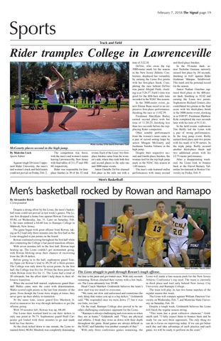 time of 5:22.10. DeVito, who owns the top 3000-meter mark for the season in the New Jersey Athletic Conference, displayed her versatility by earning the Lions five points with her first-place finish. Completing the race behind DeVito was junior Abigail Faith, clocking in at 5:26.37. Faith’s time was good for the fifth-best mile time recorded in the NJAC this season. In the 3000-meter event, junior Emma Bean raced to an impressive first-place performance, finishing the race in 11:02.39. Freshman MaryKate Bailey earned second place with her time of 11:20.25, finishing less than two seconds before the topplacing Rider competitor. Other notable performances from the women’s team came in a pair of record setting leaps by senior Meagan McGourty and freshman Tamika Voltaire in the high jump. Despite their respective second and fourth-place finishes, the women tied for the top high jump mark in the NJAC this season at 1.60 meters. The men’s side featured stellar performances with many second