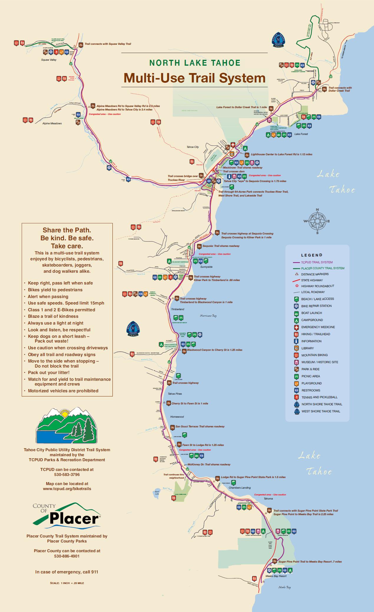 The perfect way to enjoy the Tahoe seasons and tour the North and West Shore of Lake Tahoe is by using our 23-mile multi-use trail network Our recreational trails are open to bicyclists, e-bikes, walkers, joggers, strollers, and even anglers enjoying the views Please leash your dogs, keep an eye out for maintenance workers & equipment, and be respectful of other users.