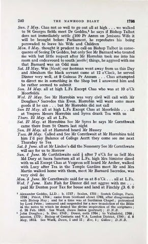 Selection . As it was impracticable to print the whole diary, some principles of selectionhad to be formed. A negative principle has been to omit the business recordssuch as sales of cloth , accounts, payments into the bank, etc. This at once halved the material A positive principle has been to include everything referring, however remotely, to the Catholic life of the times. The diary is a unique document in this respect, for, although thereis a considerableamount of material on what may be termed Catholic publicaffairs , there is almost nothing on the privatelives ofmiddleclass Catholic families. These two main principles ofselection did not solve the problem of how to deal with such matters as the conduct of Mawhood's country estate, his work as a Surveyorof the Highwayfor Finchley, or as a Vestry-man ofSt. Bartholomewthe-Great, and other general topics In order to keep within reasonablelimits of space, it seemed best to give, here and there, sampleextracts referring to these aspects of Mawhood's life ; it is important to note how far a Catholic at that period could take his part in civicand culturallife.