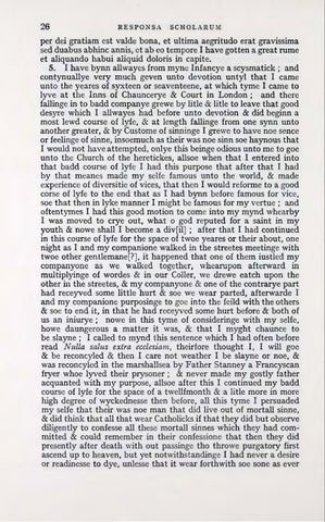 5. Tota anteacta vita inter hereticos natus et educatus alte erroribus immersus sum ; Vatiniano vel potius Calviniano odio in Ecclesiam Catholicam exarsi : omnia studia, preces, vota, contra Ecclesiam collimavi ; Sed vigesimo nono aetatis anno coepi aliquid remittere de illo furore Et in alteram insilui opinionem, ut crederem unam esse et Catholicorum et Protestantium Ecclesiam, neque ad salutem multum referre, a quibus quis sentiat, priores tamen purioresqueesseHaereticorum Calvinianorum partes Atque in hoc luto defixus penitus haerebam. Et iam libros famae conciliatores in Catholicos scripturiregestiebam: iam malefecis beneficiis, et praebendis aureis onerandoshumeros parabam : iam ambitionis terminos inter summos regni honores animo defigebam: iam pulchellae sponsae diu ambitae nuptias faelixprocus parabam, quasad unius Prebendaeaccessionem quae400 coronatos annuos praeberet, distuleram ; eamque ob causam Comitem Essexium sectabar, qui maturrimenegotium se confecturum receperat. Cum ecce versanti mihi in aula (ubi aeque difficile est fieri bonum ac reperire), et librum quendam Reginaldi nostri pro causa Catholica conscriptum oscitanter legenti, nondum transcursa Praefatione, tantum subito lucis divinae fulgur animitus hausi, tantaminsolitigaudii asperginem medullitussensi, ut illo ipsomomento protinus exiluerimgestiens ,et in hanc apud me vocem proruperim Nunc Catholicus sum . Extemplo ergo valedicto omnibus Aulae, Comiti , Praebendae , Cantabrigiam revolo, et raptim nuncio sponsae amoribusque remisso , revoco me in solitudinem , ad preces et lachrimas et luctusetieiunia et humicubationes : ut praeteritae vitae sordibusdepuratis sereniori oculo et corde, fidei et charitatis radios imbiberem, et Catholicae disciplinae honorem vitae novitate aemularer Simulque deum obnixe rogavi,utsemestris temporis pacem etinduciasmihilargiretur, in quo ita me in omnibus Controversiis instruerem, ut possem cum haereticis sine dedecore causae manus conserere, quandocumqueeo ventum esset . Atque ita deo indulgente factum est. Interim concilium mihi dederunt amici totius rei conscii ut fuga transmare dilaberer priusquam res in propatulo esset Negavi mefacturumsed confidentipotius animo expectaturum quid possentPseudoepiscopi dicere aut facere. Tandem itaque deprehensus sum , et in arctam custodiam per 7 menses traditus, unde saepe protractus coram commissariis regiis apparui . Quos oblatis centum et supra pro Causa Catholica rationibus , lacessivi ut unam quamcumque solverent , stipulatus daturum me manus si satisfacerent Quid multis obstruxi eorum ora, ut non auderent provocati postulati flagitati verbum mutire: Sed postquam amplis pollicitationibus precibus minis infractumet immotum persistereviderent, exuerunt me omnibus dignitatibus et bonis et ludicris ministellorumordinibus