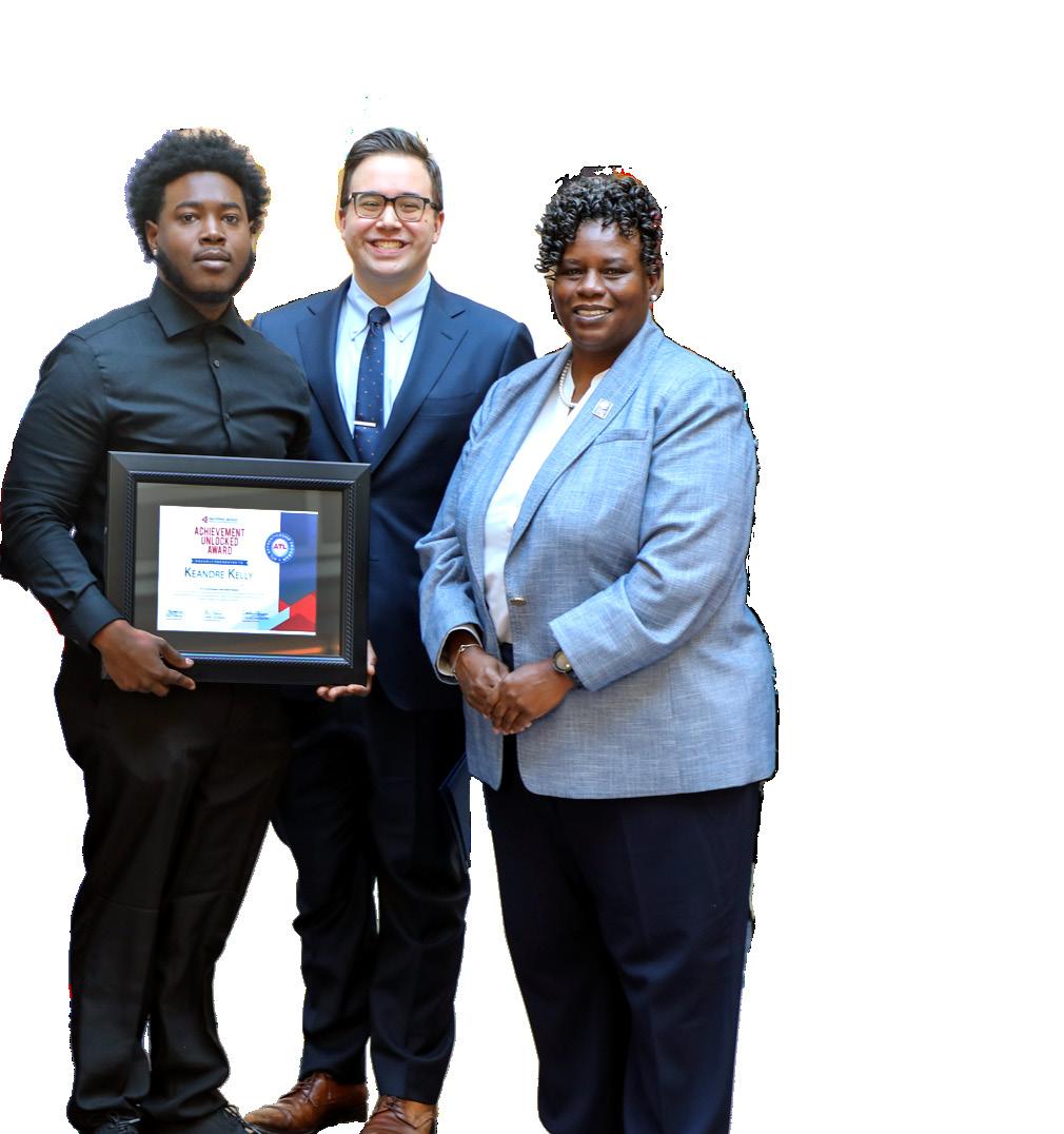 Apprentice Ke’Andre Kelly, Technical College System of Georgia Director of Business Services Brandon Ona, and Atlanta Technical College President Dr. Victoria Seals (l to r)