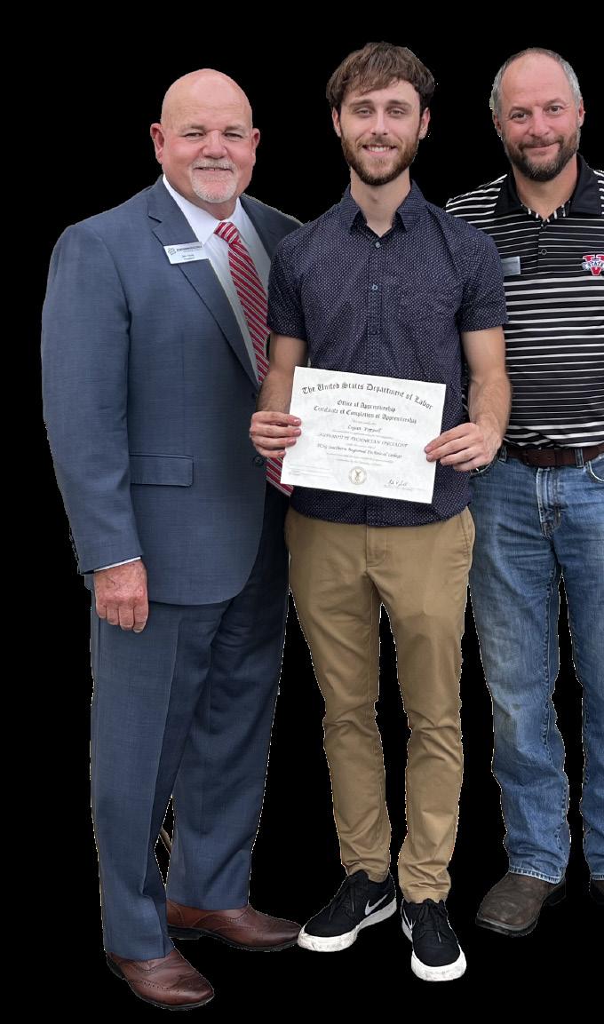 Southern Regional Technical College President Jim Glass, Apprentice Logan Poppell, and Southern Regional Technical College Program Director and instructor